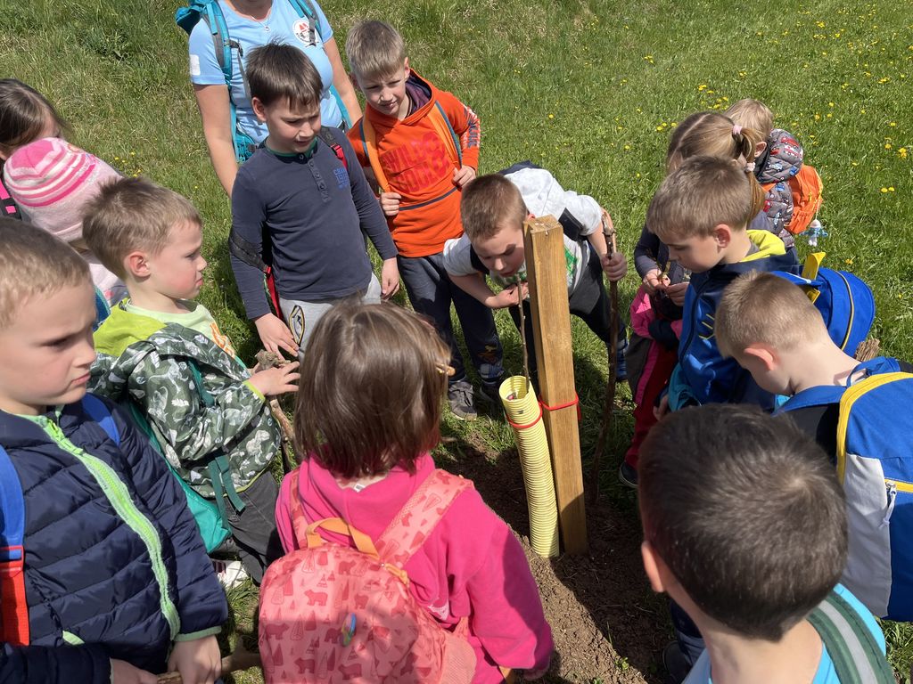 Opazovali smo pravkar nasajene mlade jablane in opazili, da so sadike zaščitene s cevjo. Učenci so razmišljali, zakaj je tako in za domačo nalogo dobili dve vprašanji: S čim se prehranjuje krt in kdo gloda mlade koreninice rastlin?