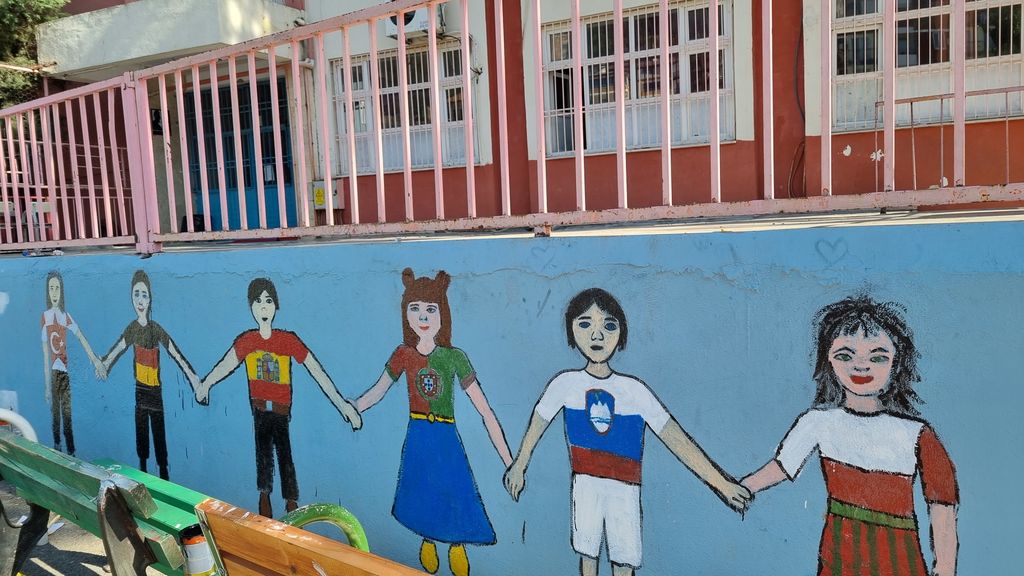 V ponedeljek smo prvič prišli v turško šolo. Tam so nas pričakali otroci z dobrodošlico. Bilo je zelo lepo in nenavadno za nas. Bilo je zanimivo, da otroci že pri tako rosnih letih znajo tako dobro plesati njihovo folkloro. Potem smo se pogovarjali z drugimi otroki. Bili so zelo pogumni, kar nas je presenetilo. Ogledali smo si šolo, ki je zelo velika in drugačna. Na koncu dneva pa smo slikali na steno. Ta dan je bil zelo vroč, lep in seveda utrujajoč.