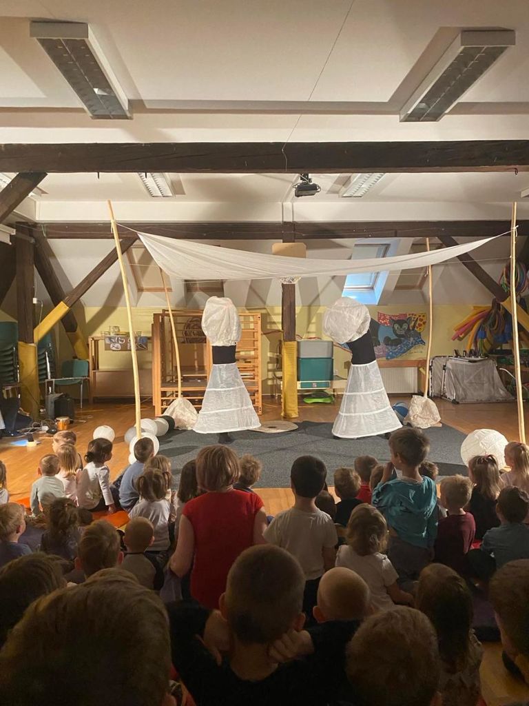 Dve igralki-glasbenici sta s preprostimi gibi, nežnimi igricami in čutno postavitvijo ustvarili okolje, v katerem so otroci v miru opazovali, poslušali in doživljali svet okoli sebe. Predstava je bila zasnovana tako, da spodbuja otrokovo čutno zaznavanje, pozornost, zbranost ter razvijanje estetskega doživljanja sveta, kar je tudi eno izmed ključnih ciljev Kurikuluma za vrtce. Otroci so bili očarani nad dogajanjem na odru, polnem mehkih zvokov, svetlobnih učinkov in barvnih prelivov, ki so spodbujali njihovo domišljijo in senzorne izkušnje.