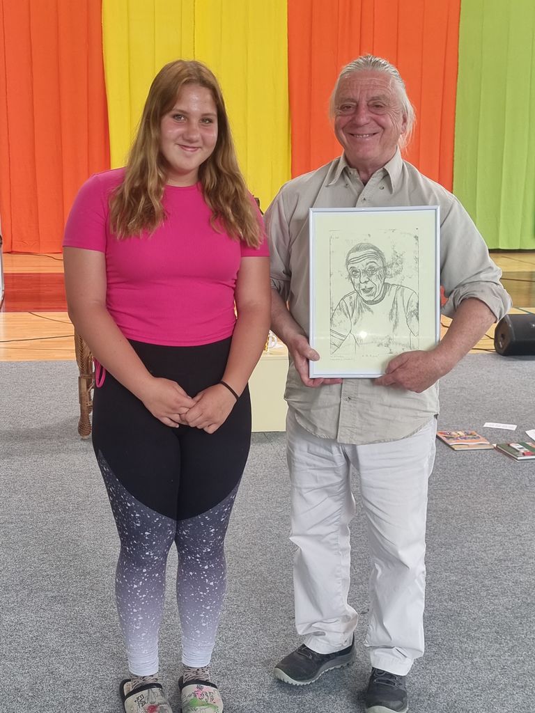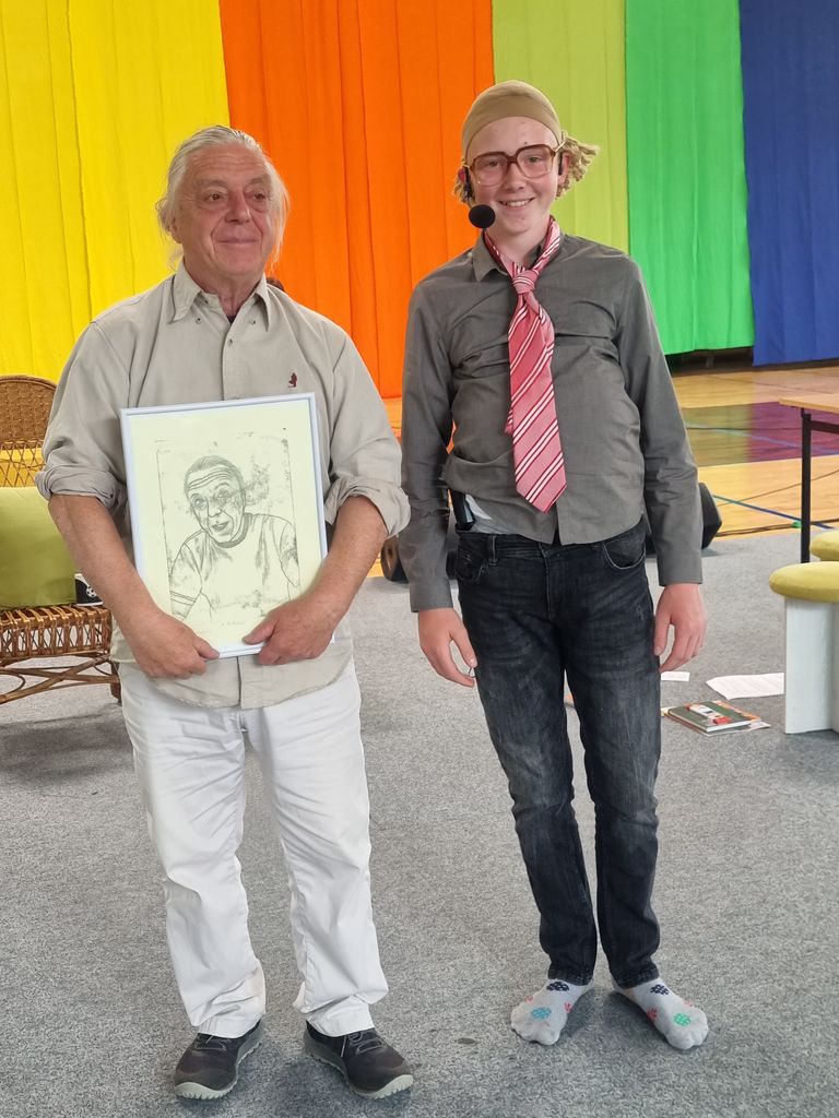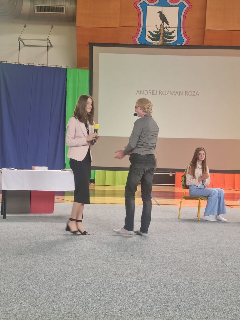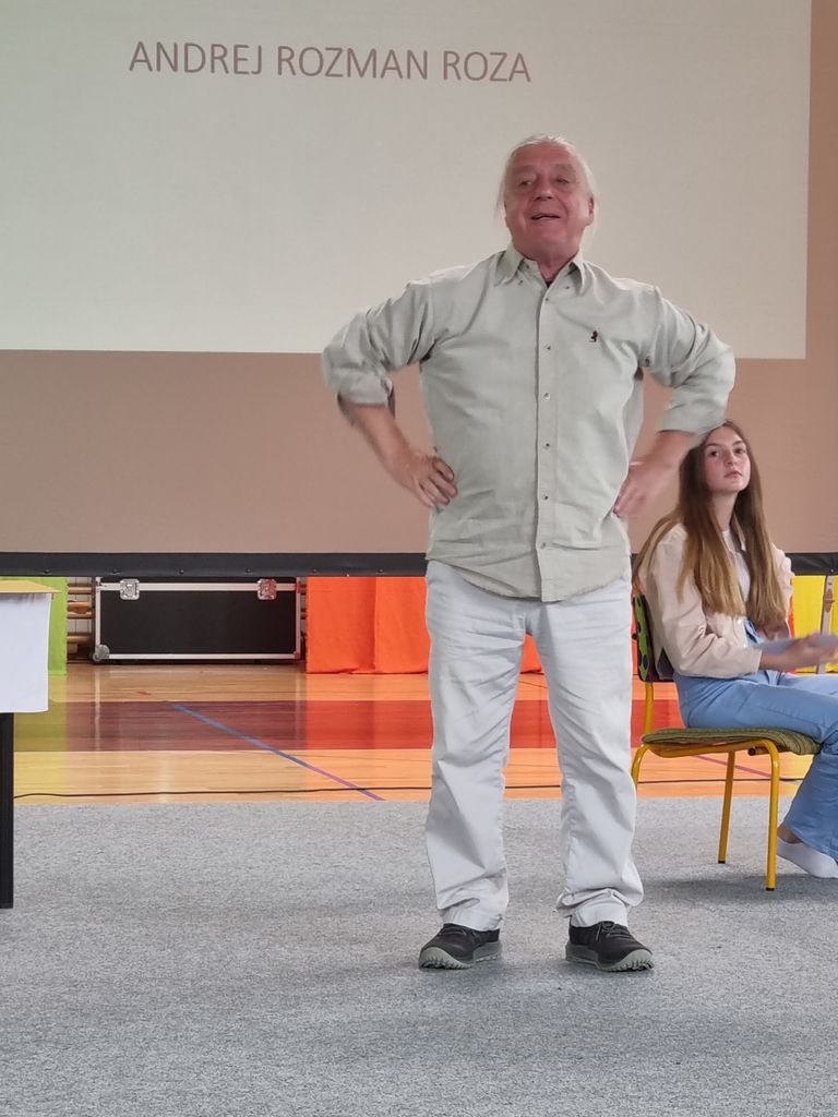 V nadaljevanju smo uživali ob programu, ki ga je za nas pripravil Andrej Rozman Roza. Ponosni smo, da nas je obiskal, saj je med drugim tudi prejemnik Levstikove nagrade za življenjsko delo. Podeljujejo jo za ustvarjanje najboljšim avtorjem na področju otroške in mladinske književnosti. Leta 2021 se je uvrstil tudi na častno listo avtorjev Mednarodne zveze za otroško in mladinsko književnost – IBBY. Ob koncu prireditve je gosta s portretom, ki ga je ustvarila ob podpori mentorice Tine Žličar, razveselila Zala Miklavc iz 8. b.