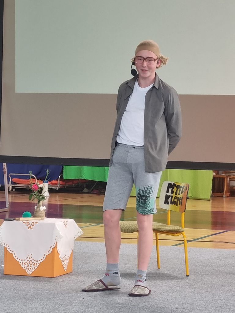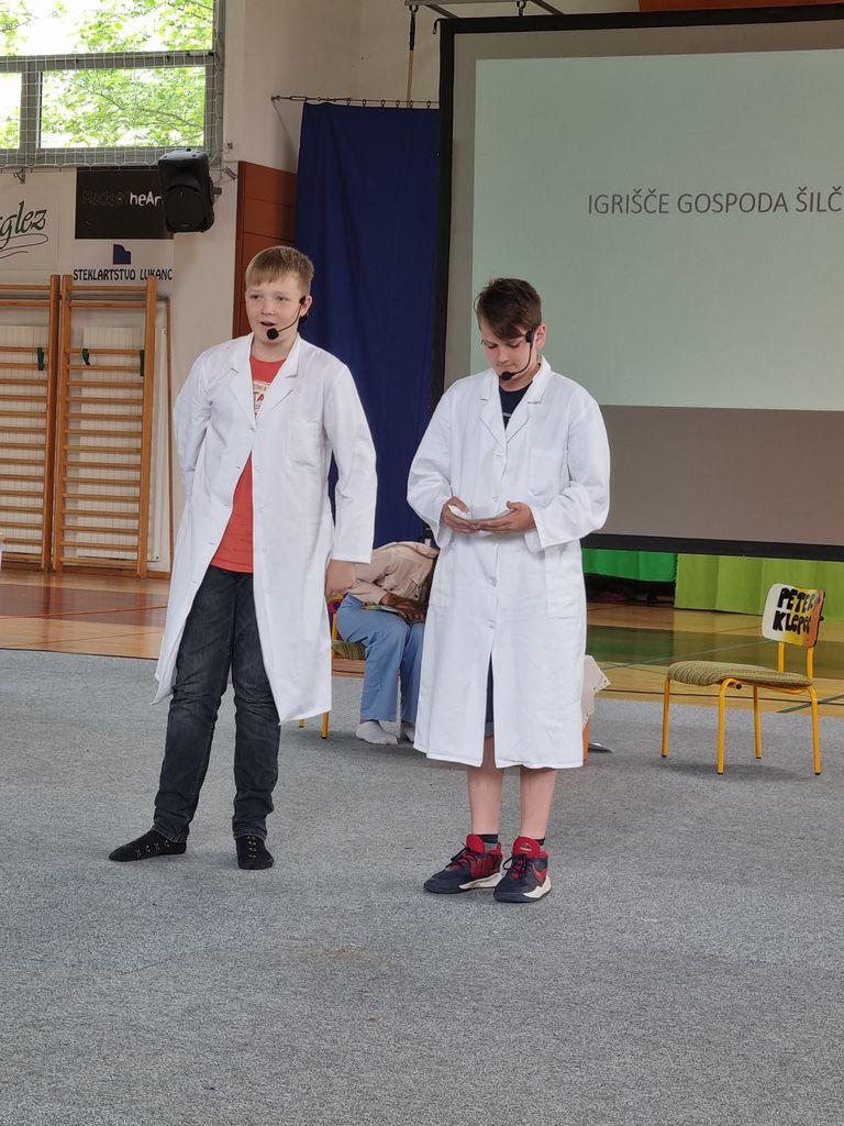 Na igrišču gospoda Šilčka je glavno vlogo imenitno odigral Mitja Drolc iz 8. a. Pred njim je bila zahtevna naloga, še zlasti je bilo težko nastopiti pred polno dvorano, potem ko skoraj dve leti nismo bili vajeni nastopati pred tako veliko publiko. Mitja se izziva ni ustrašil in je potrdil, da v sebi skriva igralski talent. Naj mu bo za spodbudo to, da ga je pohvalil tudi Andrej Rozman Roza, ki je sam komik in igralec. Za odigrano vlogo Mitju čestitamo in si želimo, da bi nas še kdaj razveselil na šolskem odru.