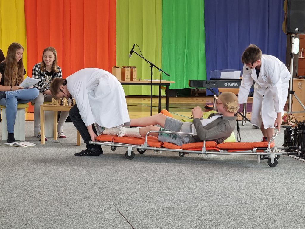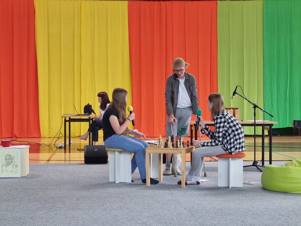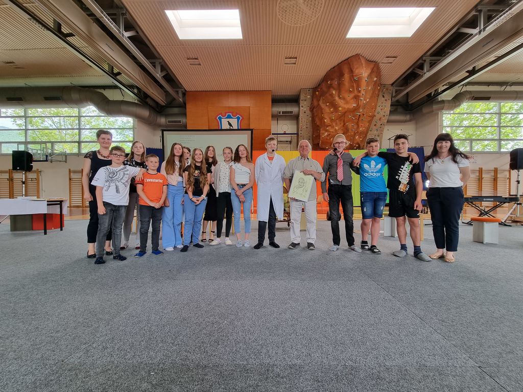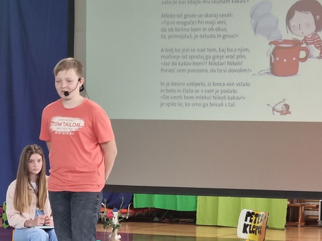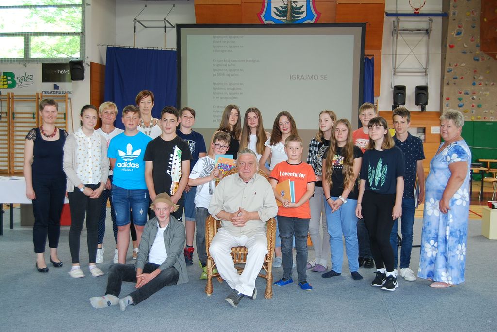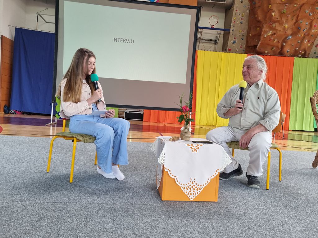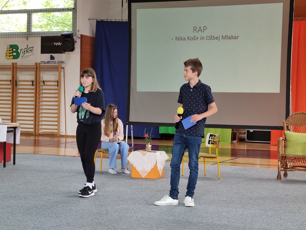 Skeče na »šolskem igrišču« ter deklamacije so poleg Mitja odlično izvedli Nikola Cestnik Ćujo iz 4. a, Gaber Šoštar iz 4. b, Ema Krajnc, Eva Učakar in Jan Kropec iz 7. a, Ajda Bogataj, Elija Jerman, Špela Kramar in Matevž Drnovšek iz 8. a ter Laura Ošlak, Tia Rovšnik in Žan Luka Klopčič iz 8. b. Glasbeno točko sta izvedla Nika Košir in Ožbej Mlakar iz 7. b. Intervju z gostom je samozavestno izvedla Ajda Bogataj.