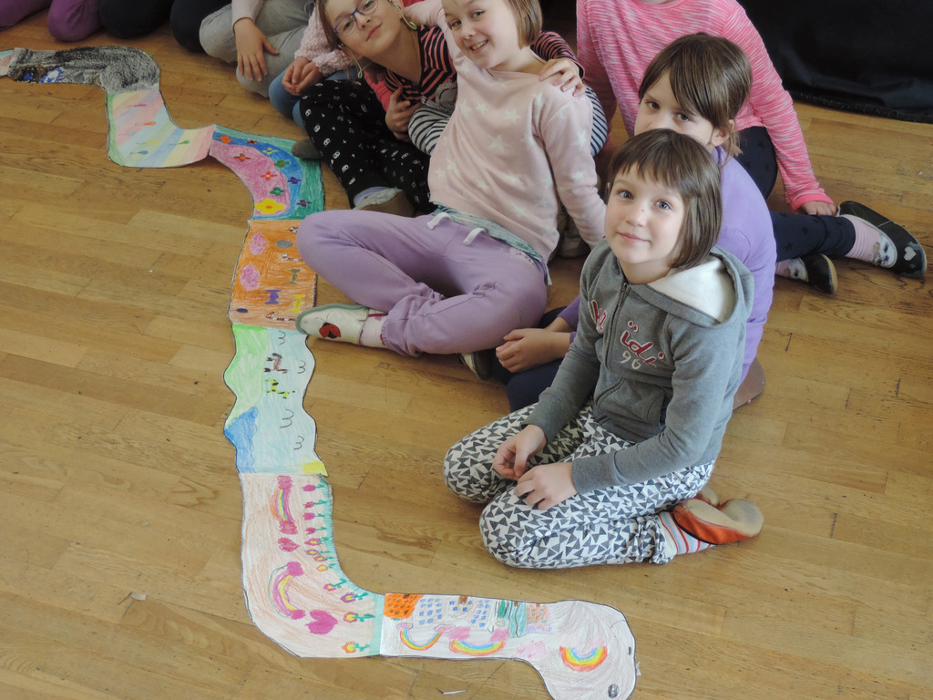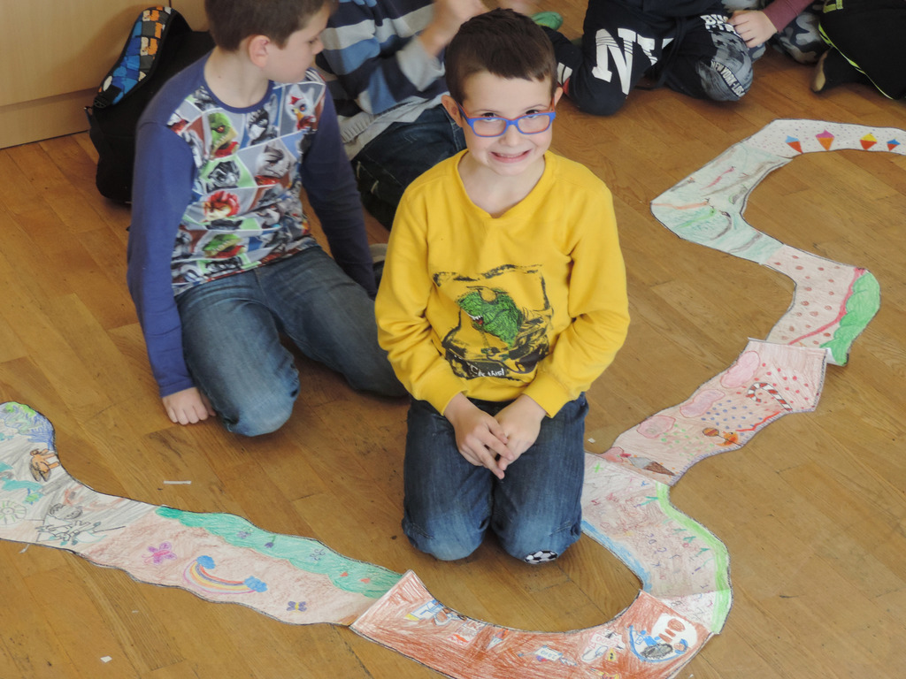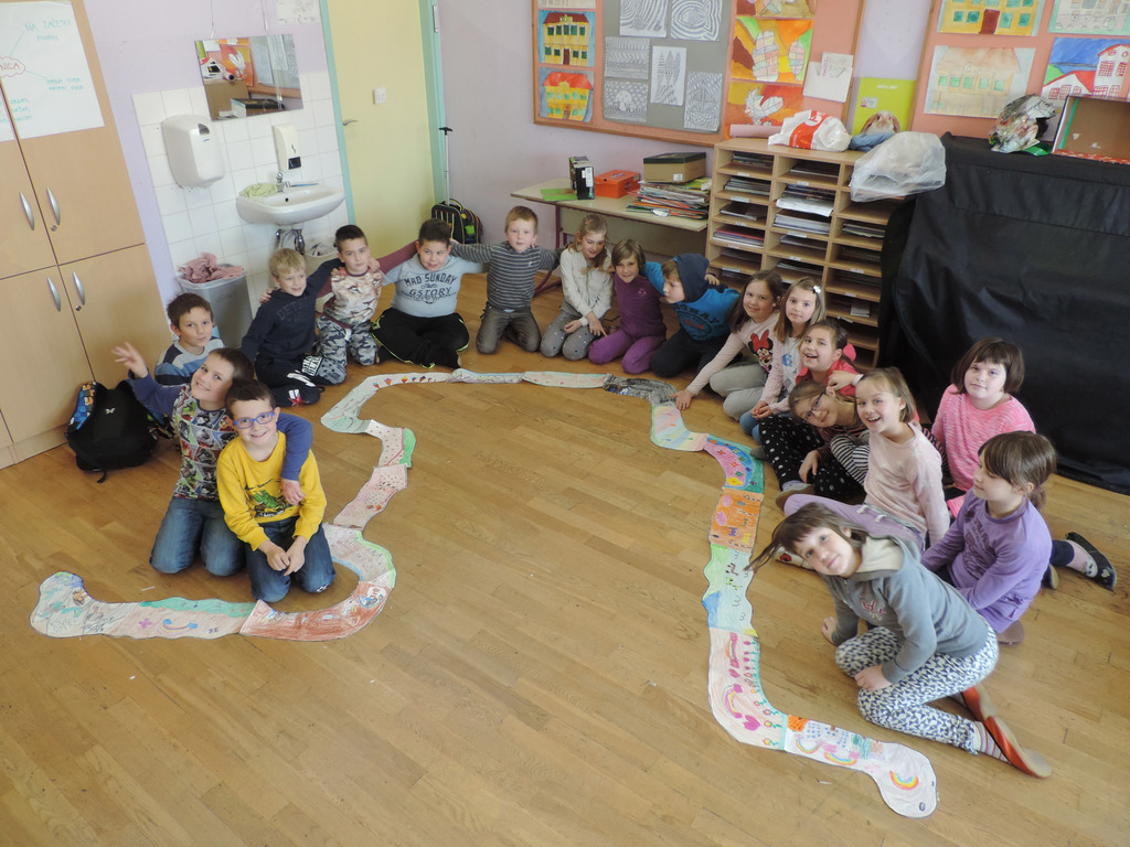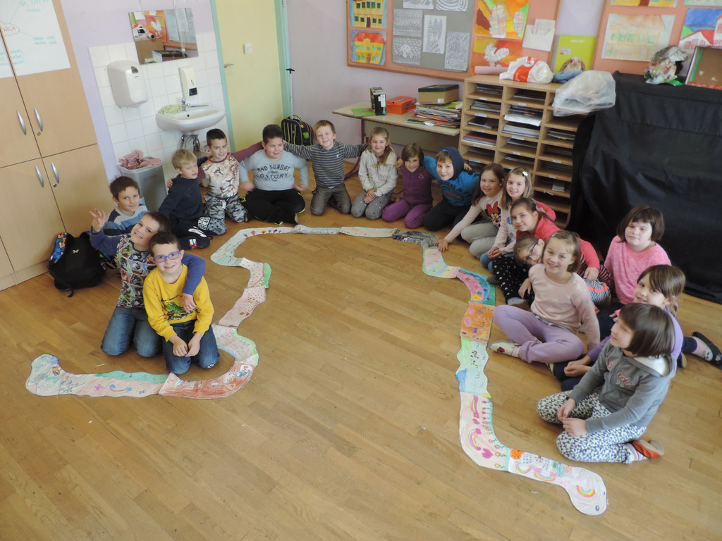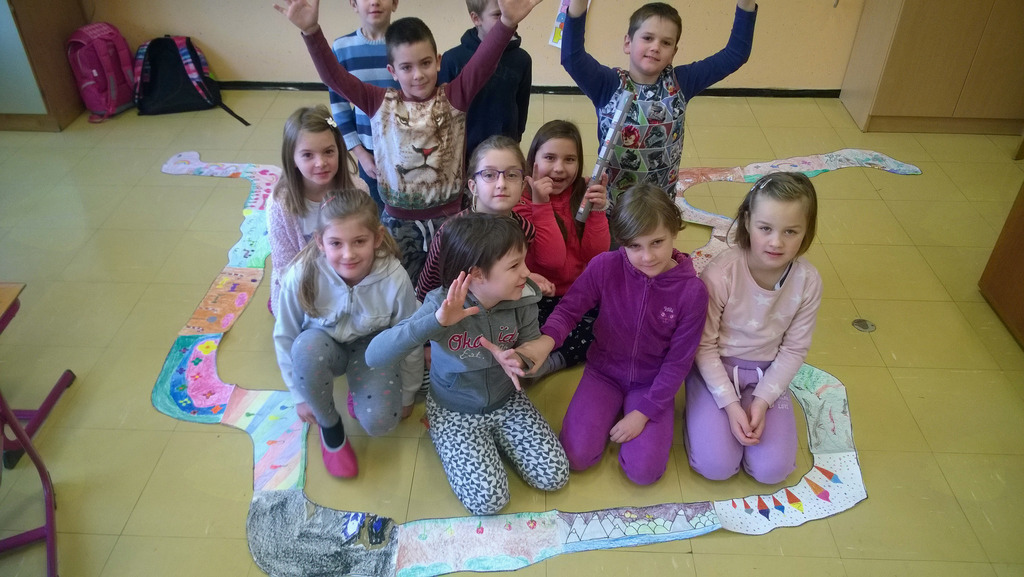 Knjiga nas je navdušila, prav tako tudi nagradna naloga. Prav vsak učenec je izdelal del ogromnega črva in ga okrasil z značilnostmi pravljične dežele.