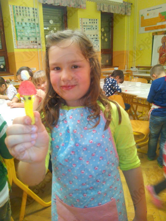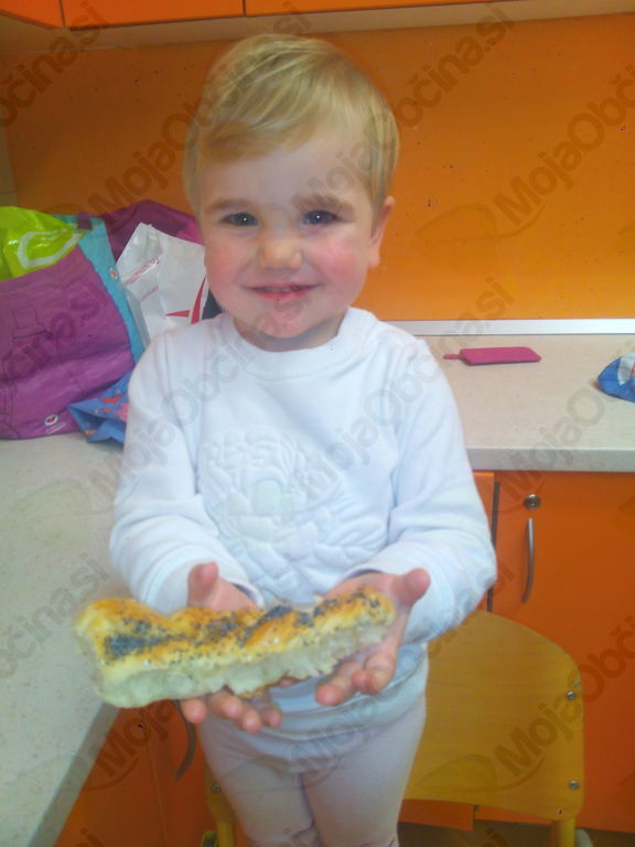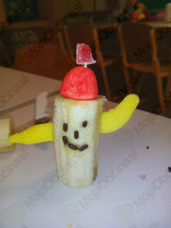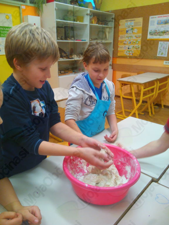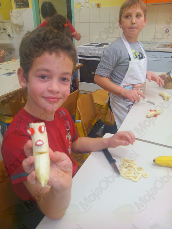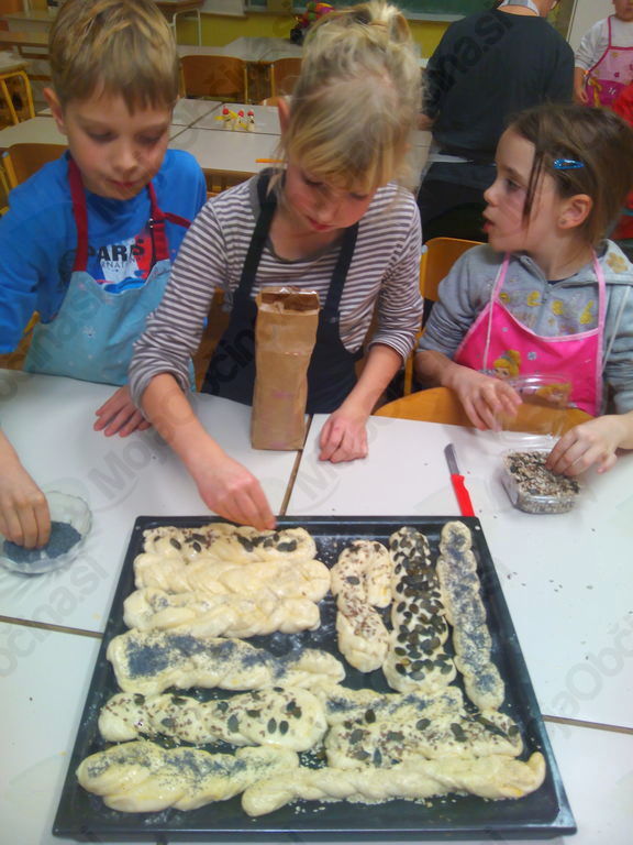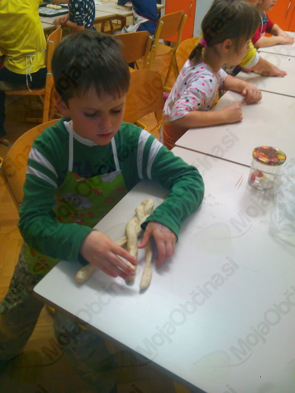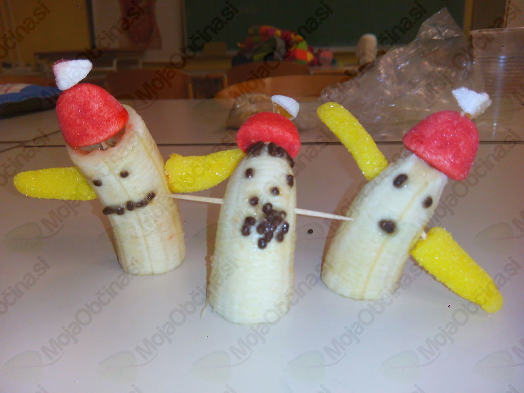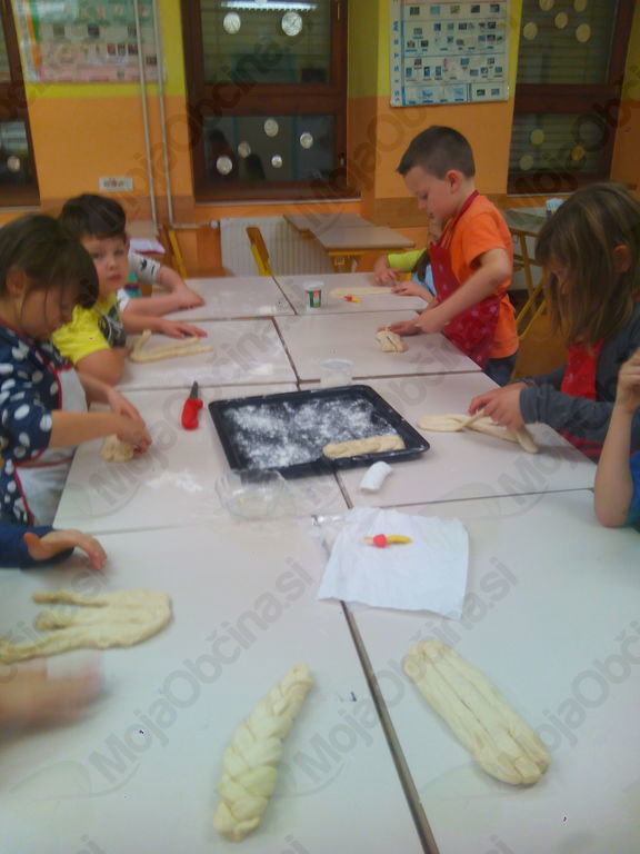Iz 1 kg moke, 1 kvasa, 2 dcl olja, 3 dcl mleka, 3 dcl vode in soli so zgnetli fino testo, ga oblikovali v manjše hlebčke in ga pustili vzhajati. Medtem so si pripravili banane in nožke, dobili zobotrebce, bonbone v obliki jagod in banan ter čokoladne mrvice. Iz vsega tega so morali s pomočjo svoje domišljije in izvirnosti nekaj napraviti in nastali so res zanimivi izdelki, povezani s prihajajočimi prazniki. Kratko, vendar sladko, saj so te stvari kmalu končale v želodcih. Medtem pa je testo pridno vzhajalo. Hlebčke so učenci malo raztegnili, razrezali na tri trakove in spletli pletenice. Namazali so jih z jajčko ter posuli z različnimi semeni. Med pečenjem so zapisali recept in pospravili učilnico. Iz pečice je pridišalo in slastne pletenice so učenci odnesli domov.