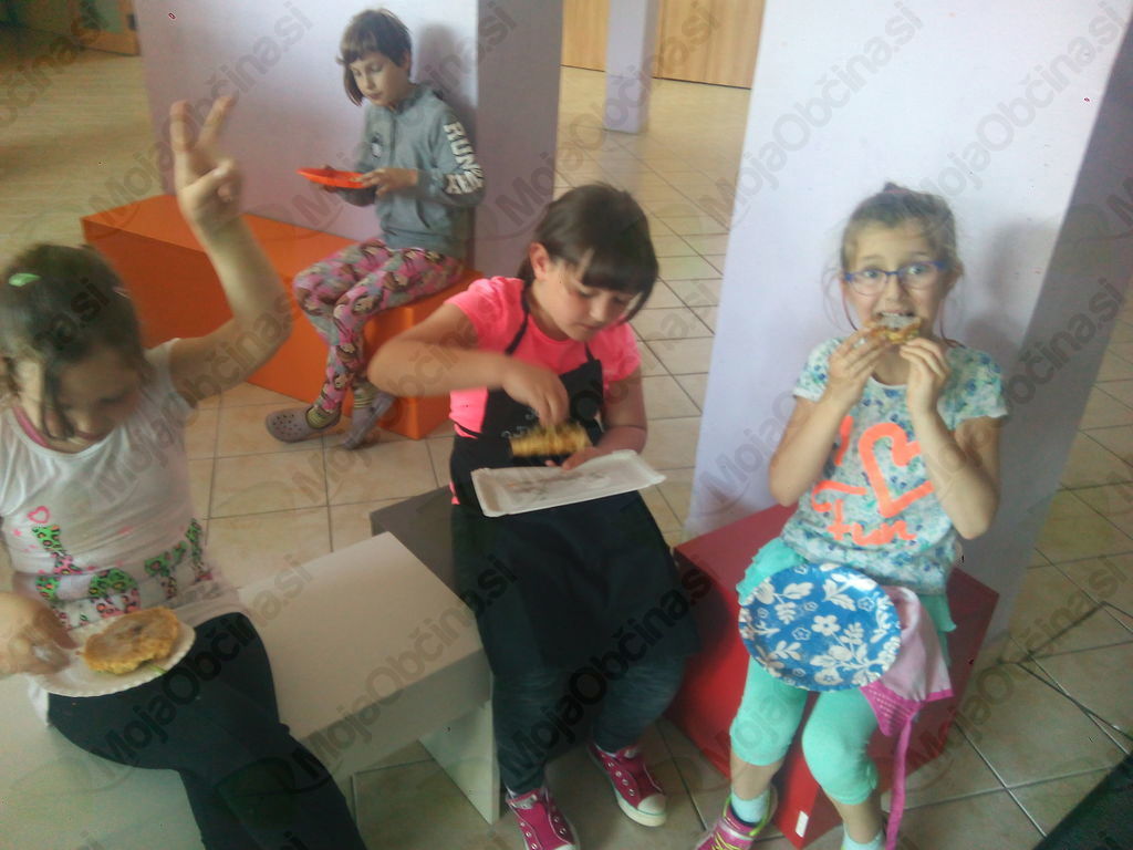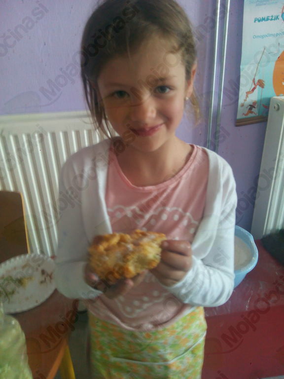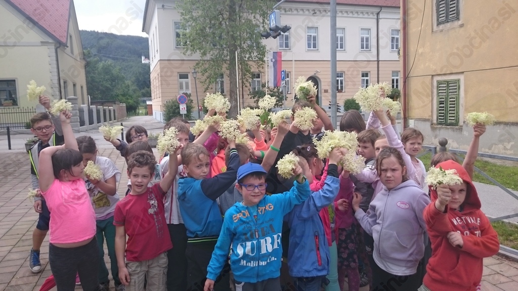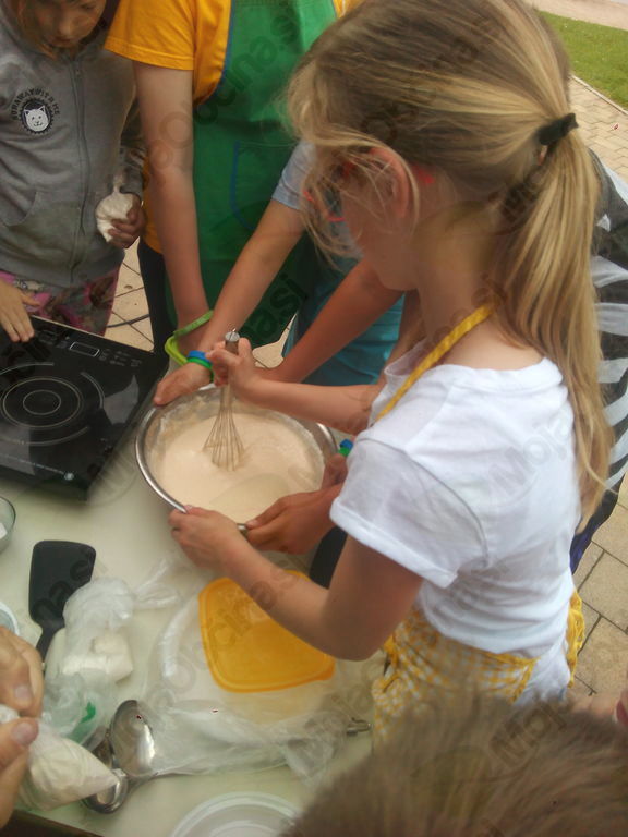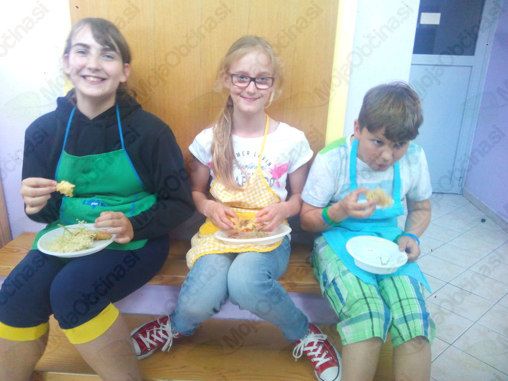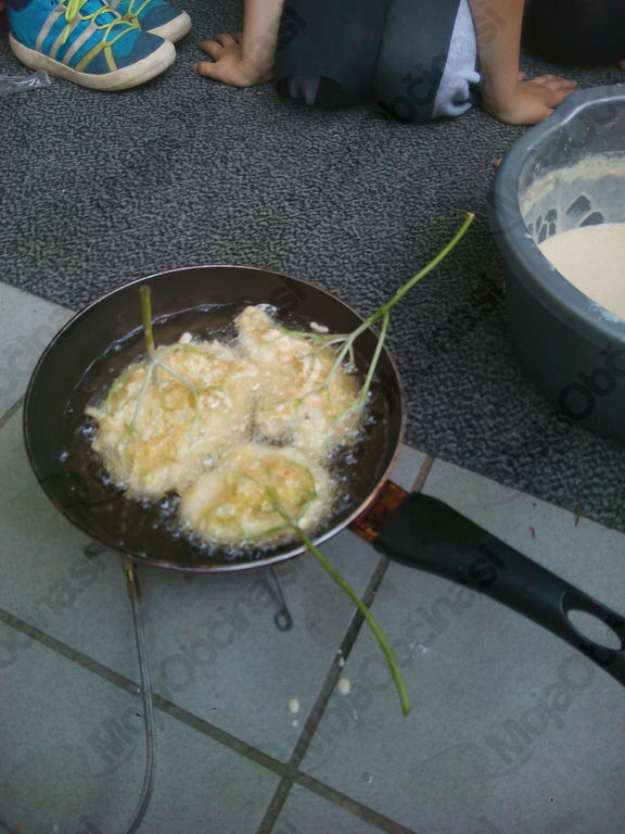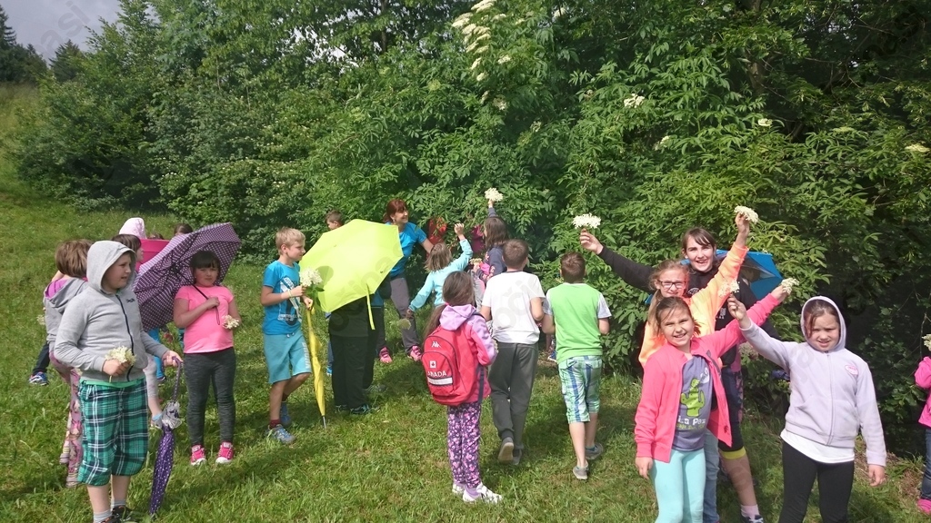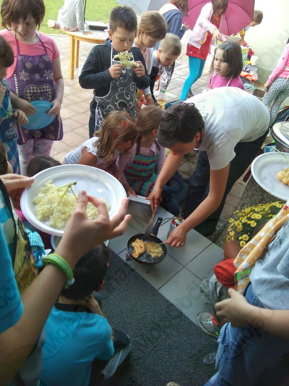 S kuharji smo tokrat zapustili gospodinjsko učilnico. Vzeli smo pot pod noge in jo mahnili na Marelico. Nabrali smo bezgovo cvetje in se vrnili pred šolo. Vreme je nazadnje reklo zadnjo besedo in načrt, da si pripravimo pojedino na Gorici, je splaval po vodi. Kar pred šolo smo si pod streho pripravili pivsko testo in na plinskih gorilnikih cvrli vanj namočeno bezgovo cvetje. Njami, njami! Dodali smo malo sladkorja in cimeta in jed je bila odlična. Seveda smo recept tudi zapisali. Ker je sreča na strani pogumnih, smo zadovoljni in siti pod mavričnim nebom zapustili šolo.