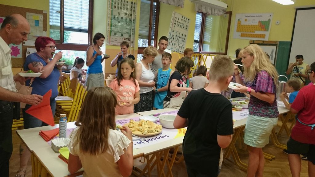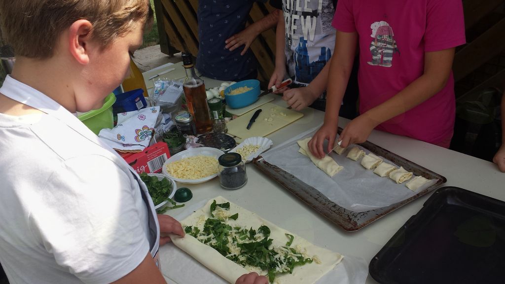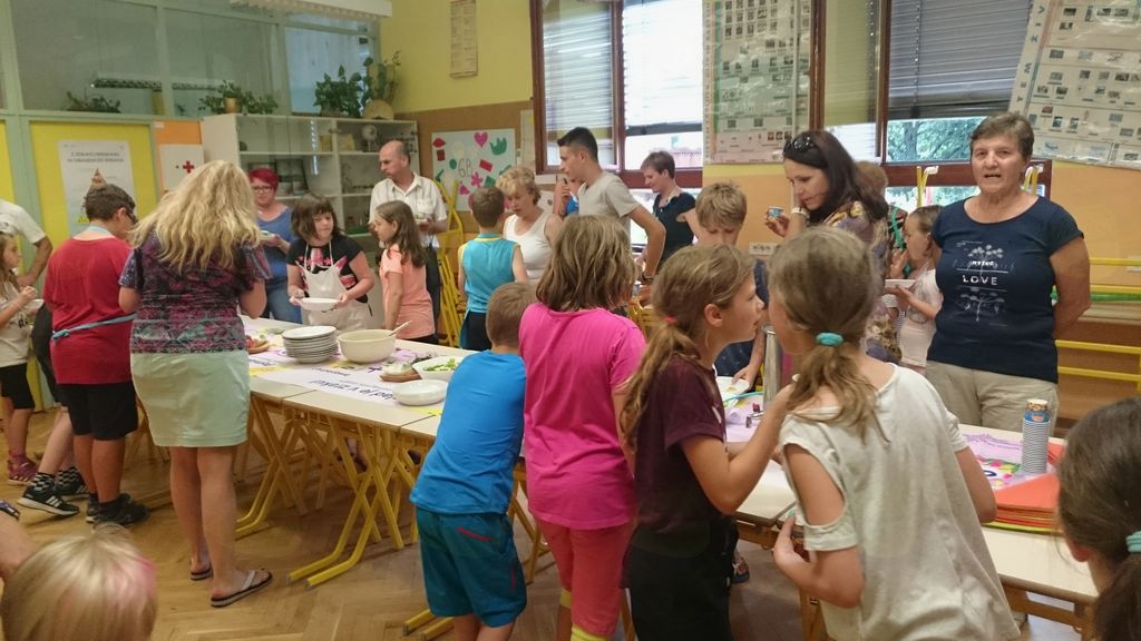 Zadnje srečanje kuharsko-vrtnarskega krožka smo si zamislili na našem čudovitem šolskem vrtu. Pridno smo nabrali pehtran, meto, blitvo in vse zavili v sirove zavitke iz listnatega testa. Pobrali smo tudi korenček, čebulo, velik rdeč krompir, bučko, peteršilj in skuhali zelenjavno juho. Iz zelene solate in redkvice smo naredili osvežilno solato. Pripravili smo tudi pesto iz zelenega dela korenja, česna in olivnega olja. Vse to smo potem v gospodinjski učilnici prinesli na mizo in pogostili starše. Vsak kuhar je prejel majhno pozornost od mentoric in si izžrebal nagrado iz vrečke presenečenja.