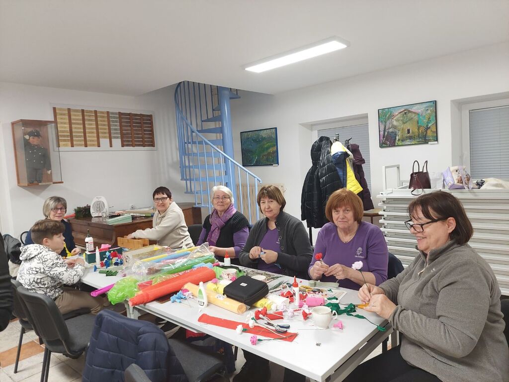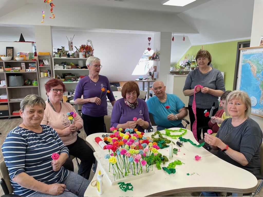 Pred cvetno nedeljo pa smo nato izvedle še delavnici za starejše. Bile smo v domu Nine Pokorn v Grmovju, kjer smo z oskrbovanci izdelovale cvetje iz krep papirja.