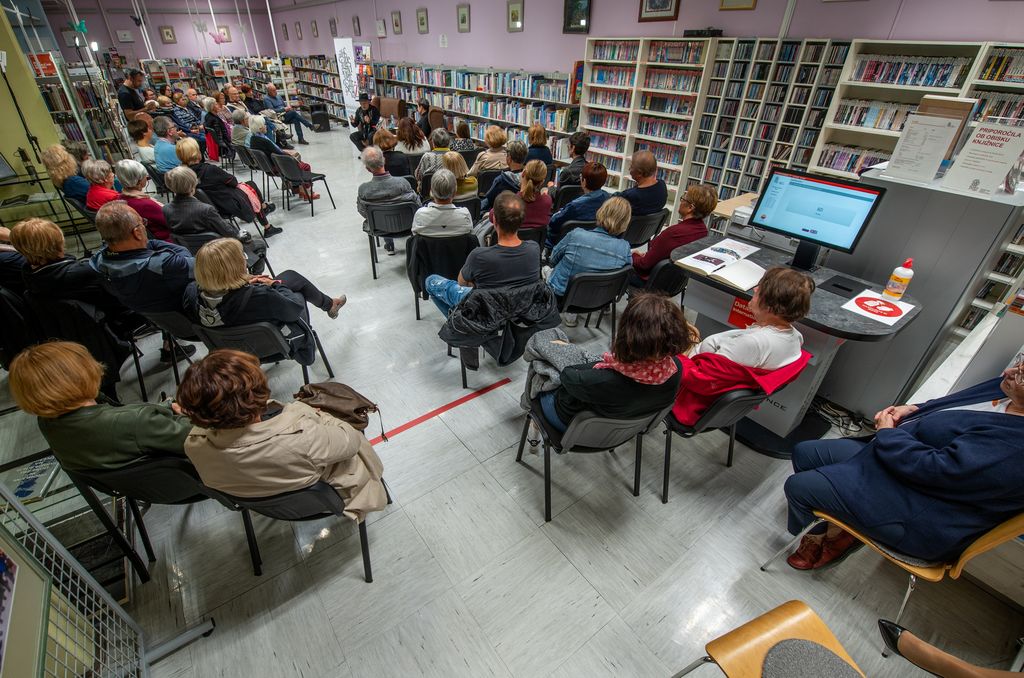 Nabito polno žalsko knjižnico je pisatelj na koncu navdušil tudi z recitiranjem pesmi v prekmurščini.