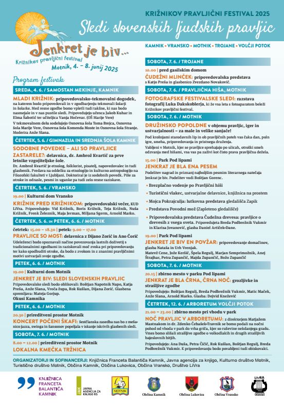 Pripovedovali bodo osnovnošolci in osnovnošolke, ki se bodo predstavili na dogodku Mladi Križnik v sredo, 4. junija, v Samostanu. Pripovedovanje je pljusnilo tudi čez občinske meje na Vransko, kjer KD LiVra pripravlja poseben dogodek v četrtek, 5. junija, in tudi na Trojane. Tu skupaj z Boštjanom Gorencem pripravljamo pripovedovalski dogodek Čudežni mlinček z Katjo Preša in Zvezdano Novaković.