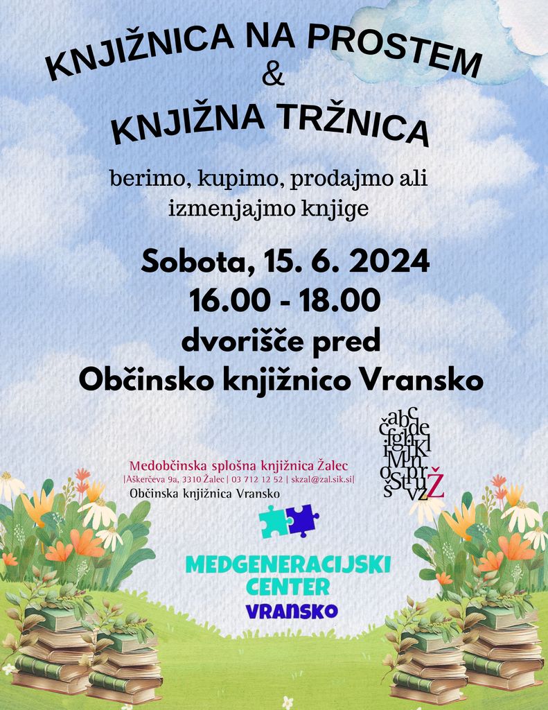 Sobota, 15. 6. 2024, od 16.00 do 18.00, dvorišče pred Občinsko knjižnjico Vransko.