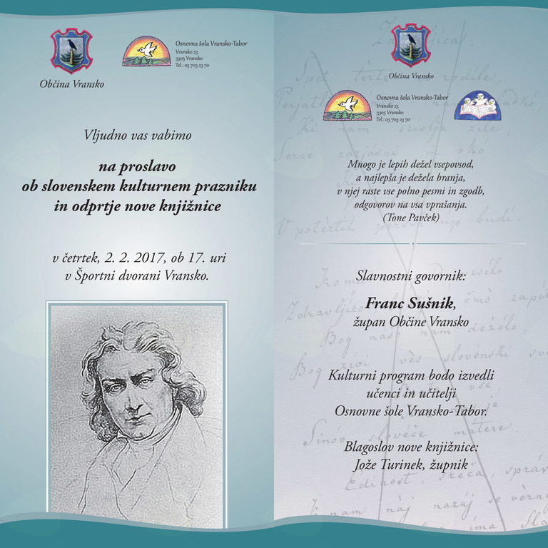 Vabljeni na proslavo ob slovenskem kulturnem prazniku in odprtje nove knjižnice v OŠ  Vransko-Tabor v četrtek, 2. 2. 2017, ob 17. uri v Športni dvorani Vransko.
