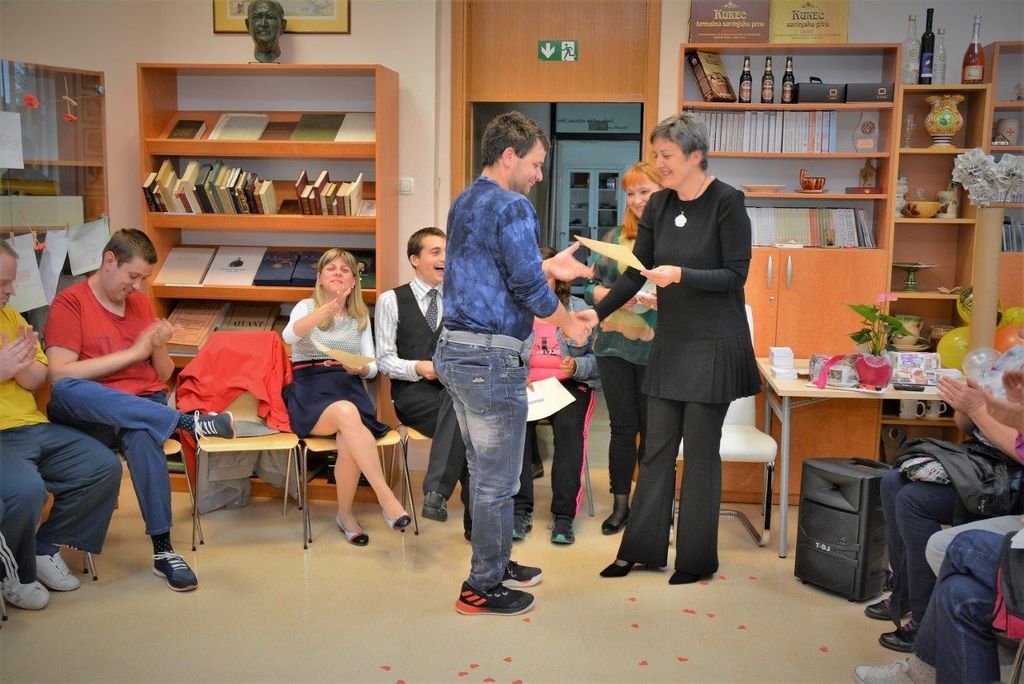 Na zadnje, svečano druženje to sezono je prišlo petnajst varovancev (prvo sezono jih je bilo osem). Prišli so skupaj s starši oz. skrbniki. Vsi so sedeli v krogu, da je med njimi stekla energija. Nad njimi so visele njihove ilustracije, ki so postavljene ena ob drugi bile videti kot prave umetnine. Pozdravila jih je direktorica knjižnice Jolanda Železnik, kasneje je Ireno Štusej varovancem podelila priznanja za skrbno poslušanje in obnavljanje zgodbic. Ko je stopil v prostor Matevž Čadej s svojo harmoniko, je vzdušje zavalovalo od enega k drugemu. Matevž je član ansamblov Akordi in Griški kvintet, trenutno pa sodelavec knjižnice. Ob spremljavi harmonike so zapeli V dolini tihi in Čebelar. Za tem so z Ireno Štusej obnovili nekaj zgodbic, ki so jih najbolj ganile, zapeli pesem Žogice Nogice in pokazali nekaj pantomime. V čokoladni hišici iz pravljice o Janku in Metki pa so se medtem celo znašli mehki sadni bomboni. Kot se za zaključek spodobi, so na koncu ob harmoniki zaplesali.