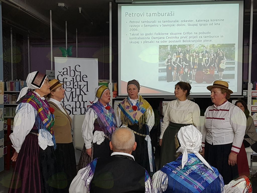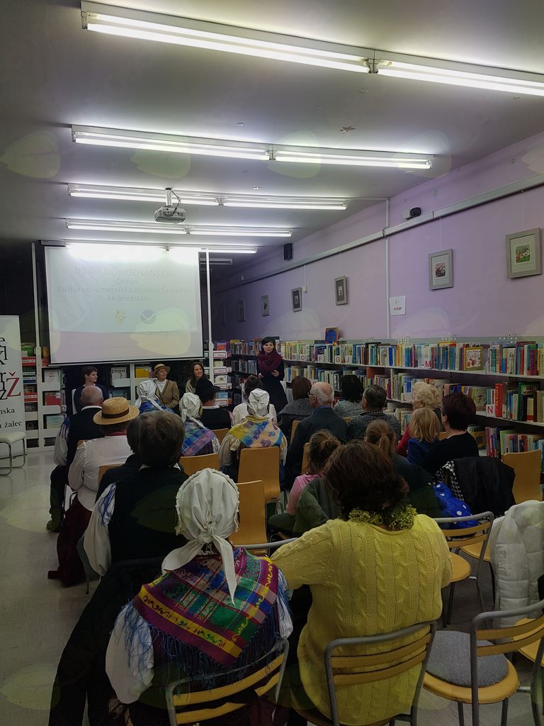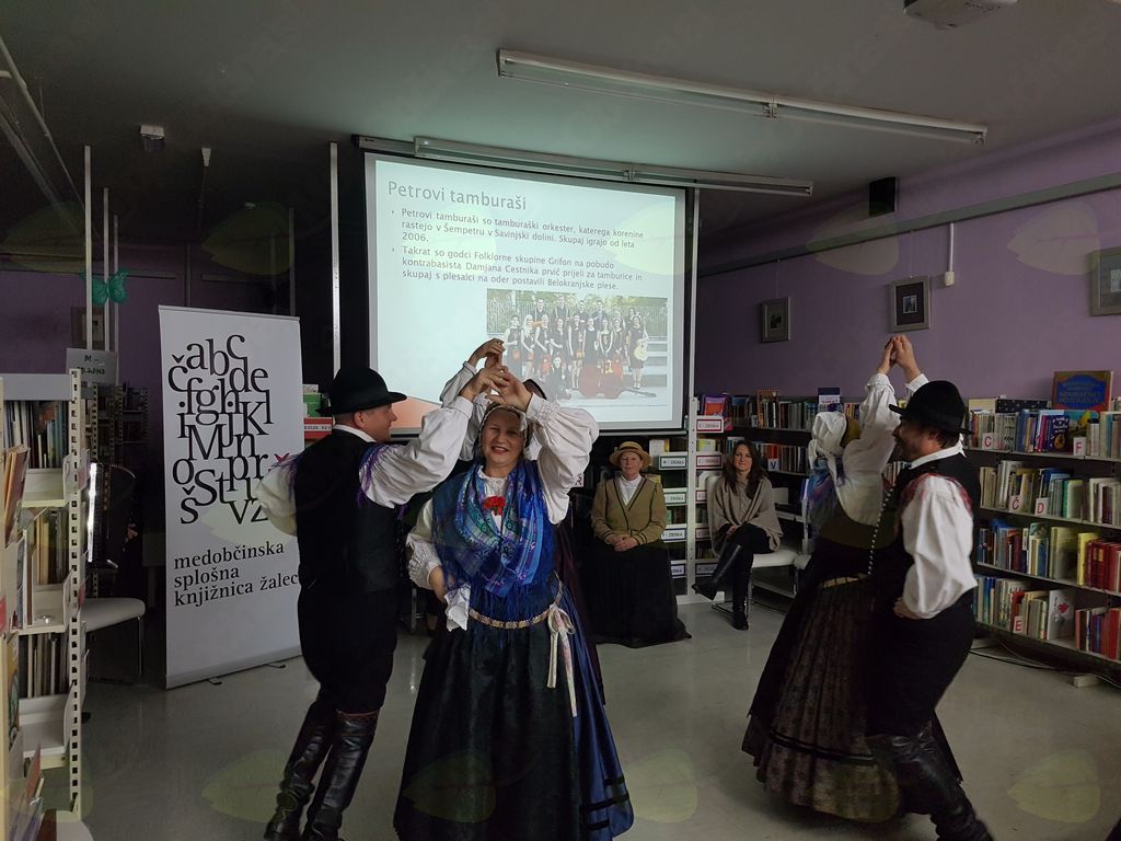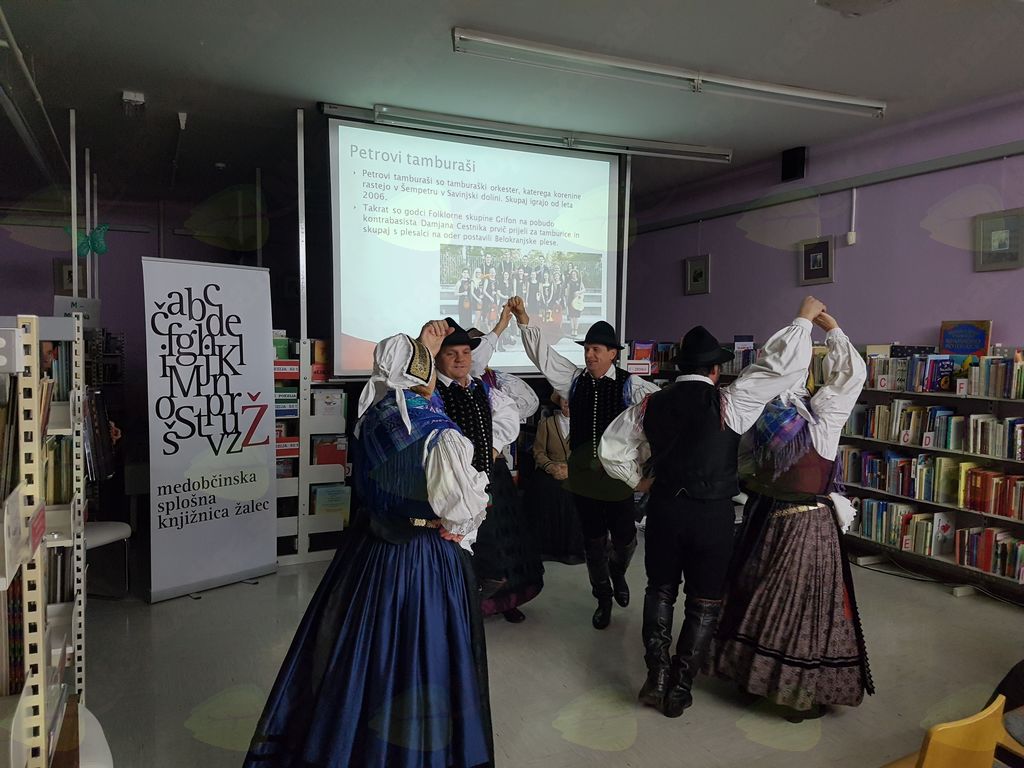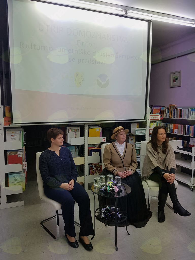 V ponedeljek, 3. decembra 2018, smo na Ta veseli dan kulture v Medobčinsko splošno knjižnico Žalec na Utrip domoznanstva povabili Grifon Kulturno-umetniško društvo iz Šempetra, ki je letos praznovalo že 60. obletnico delovanja. Društvo so leta 1958 ustanovili posamezniki, ki so se zavedali pomena ohranjanja in prenašanja bogastva narodnega izročila na mlajše generacije. Njegovo ustanovitev lahko povežemo tudi z gradnjo hmeljarskega doma v Šempetru. Že vse od začetka se je izražala potreba po ustanovitvi folklorne sekcije, ki je končno dozorela v letu 1962. Društvo pa ni samo folklorna skupina, v njem deluje tudi gledališka skupina in Petrovi tamburaši, ki so posneli že dve zgoščenki. Predsednica društva Darja Čop Sedminek, podpredsednica društva in vodja folklorne skupine Marija Zagoričnik ter vodja gledališke skupine Veronika Tavčar so predstavile delo društva in prireditve, na katerih sodelujejo. Pogovor sta vodili Karmen Kreže in Tanja Pilih. Folklorna skupina in Petrovi tamburaši nastopajo po vsej Sloveniji in tudi v tujini, za svoje delo so prejeli že precej nagrad. Člani društva menijo, da dokler bomo znali ceniti naš jezik, našo ljudsko pesem, ples, šege in vse drugo, toliko časa bomo obstajali kot narod in doprinašali svoj delež k splošni kulturi. Veseli nas, da so člani polni načrtov, in to je zagotovilo za razvoj in obstanek društva. Društvu želimo, da bi še naprej tako uspešno delovali ter obudili iz pozabe še mnogo pesmi, plesov in navad naših prednikov.