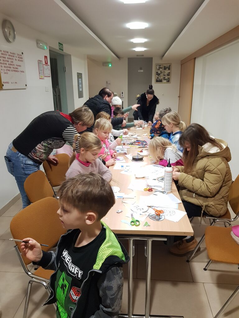 Po poslušanju pravljic je sledilo ustvarjalno poustvarjanje, na katerem so si otroci izdelali snežne krogle. Pravljična ura je potekala v prijetnem in spodbudnem vzdušju ter je otrokom ponudila priložnost za razvijanje poslušanja, domišljije in ustvarjalnega izražanja.