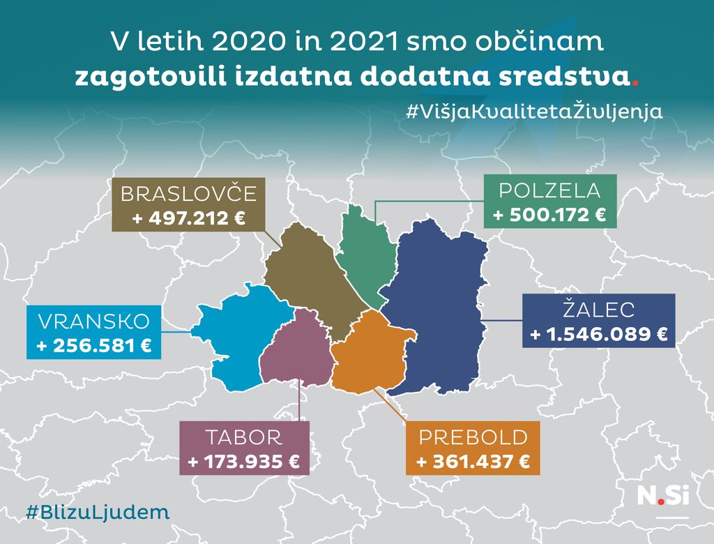 V začetku decembra je bil v Državnem zboru potrjen Zakon o finančni razbremenitvi občin (ZFRO), na osnovi katerega bodo imele vse slovenske občine skupaj letno približno 71 milijonov evrov več sredstev za zagotavljanje višje kvalitete življenja občanov. Prav tako smo v naši vladni koaliciji občinam pomagali z nedavnim zajetnim dvigom povprečnin za leti 2020 in 2021 ter jih dodatno podprli s finančno pomočjo Ministrstva za obrambo za občanke in občane. Občine najbolje poznajo potrebe in želje svojih občanov. Zato je ustrezno financiranje občin bistvenega pomena za zagotavljanje regionalnega razvoja in razvojnega preboja občin, še posebej podeželskih. Na infografiki prikazani zneski predstavljajo dodatna sredstva, ki smo jih zagotovili občinam iz Spodnje Savinjske doline: dvig povprečnin 2020 + dvig povprečnin 2021 + finančna pomoč Ministrstva za obrambo.