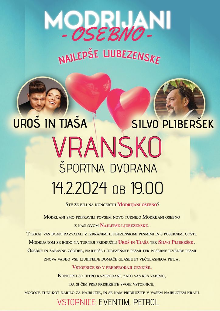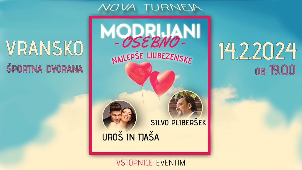 Modrijani smo pripravili povsem novo turnejo Modrijani osebno z naslovom Najlepše ljubezenske. Tokrat vas bomo razvajali z izbranimi ljubezenskimi pesmimi in s posebnimi gosti. Modrijanom se bodo na turneji pridružili Uroš in Tjaša ter Silvo Pliberšek. Osebne in zabavne zgodbe, najlepše ljubezenske pesmi ter posebne izvedbe pesmi znova vabijo vse ljubitelje domače glasbe in večglasnega petja.
