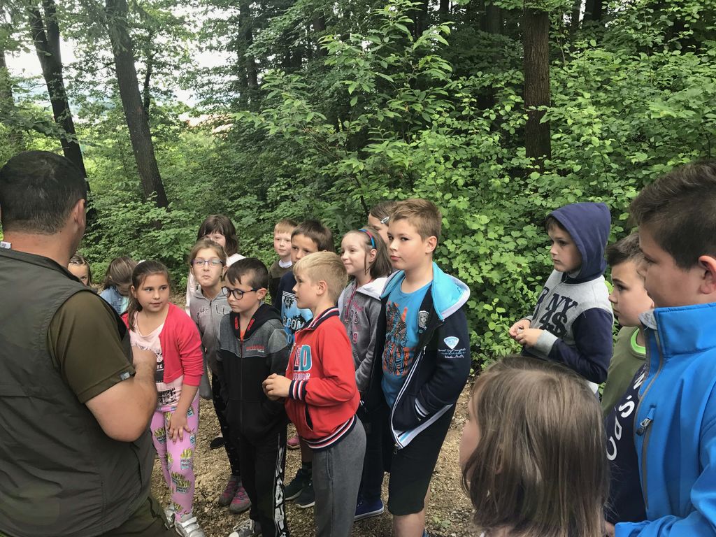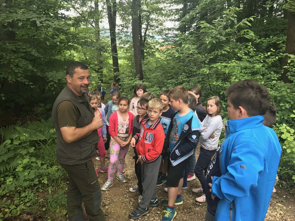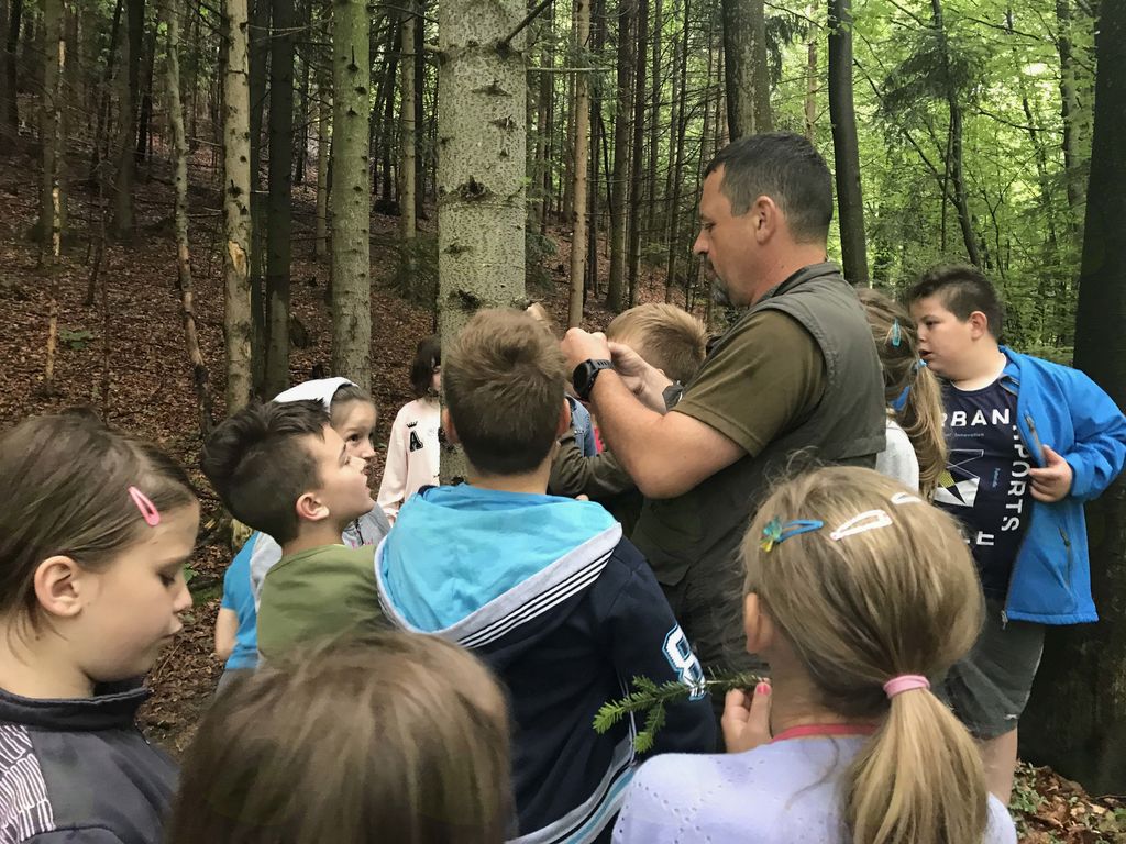 7. 6. 2017 smo četrto uro šli v gozd. Tam nas je pričakal gozdar. Povedal nam je veliko. Šli smo v gozd in spoznali drevesa. Naučili smo se žvižgati na želod. Šli smo tudi do blatne luže. Tam se kopajo divji prašiči. Obrišejo se v kakšno smreko … Na smreki smo videli dlako divjega prašiča. Jedli smo tudi posebno smolo in se vrnili domov.