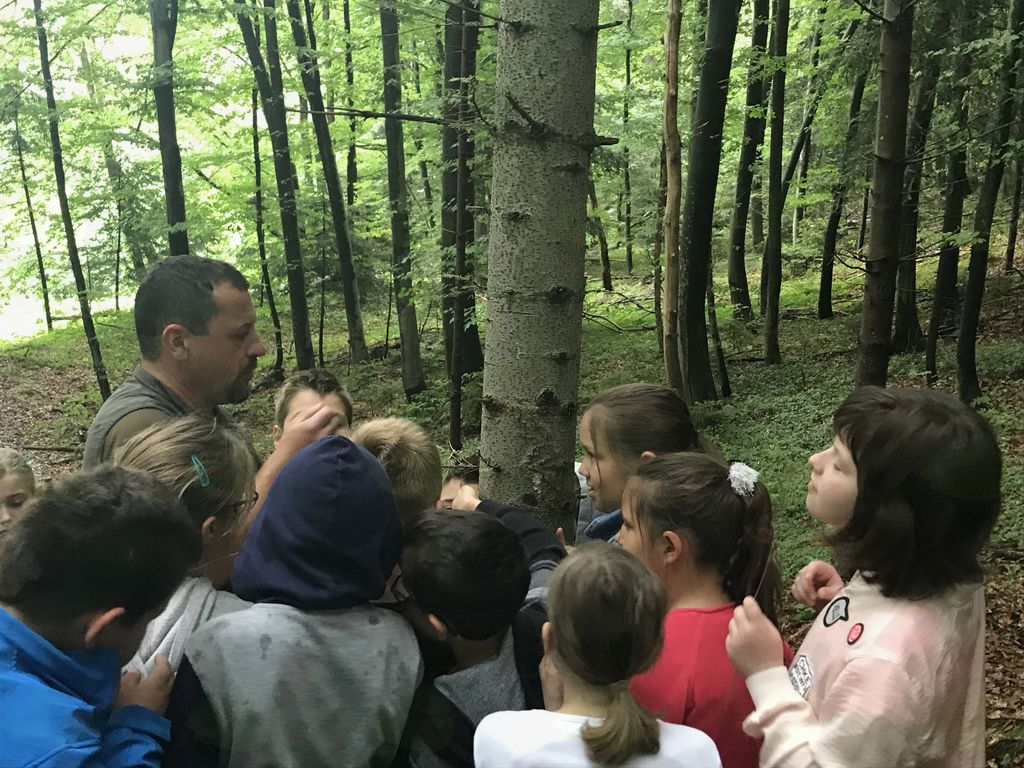 Pri gozdu nas je pričakal gozdar. Najprej nas je vprašal nekaj o drevesih. Razložil nam je nekaj o boleznih na drevesih, ki so se začele pojavljati. Potem smo šli v gozd. Ogledali smo si različna drevesa, njihove liste in lubje.