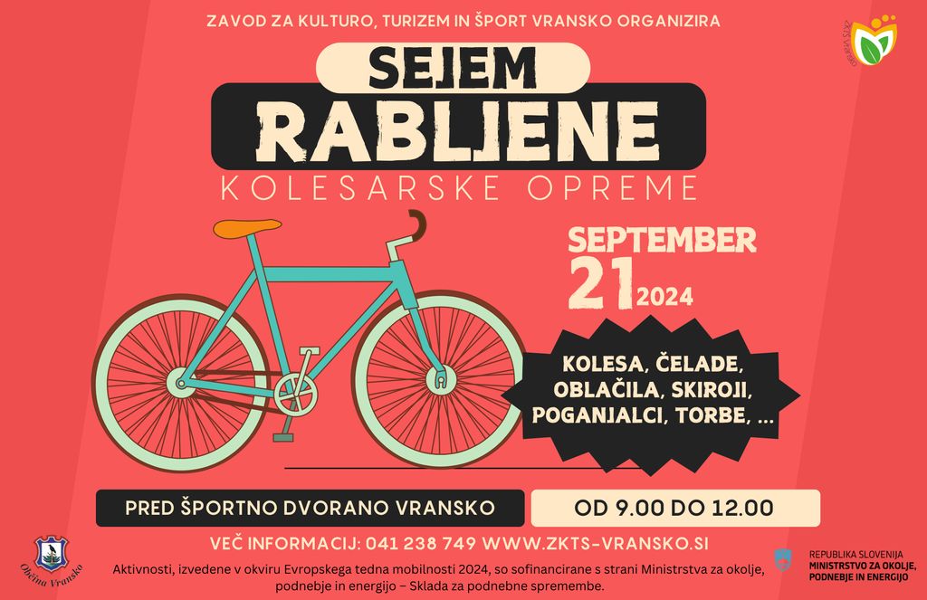 V soboto, 21. septembra, med 9. do 12. uro bo v organizaciji Zavoda za kulturo, turizem in šport Vransko pri Osnovni šoli Vransko (v primeru slabega vremena v Športni dvorani Vransko) potekal sejem rabljene kolesarske opreme.
