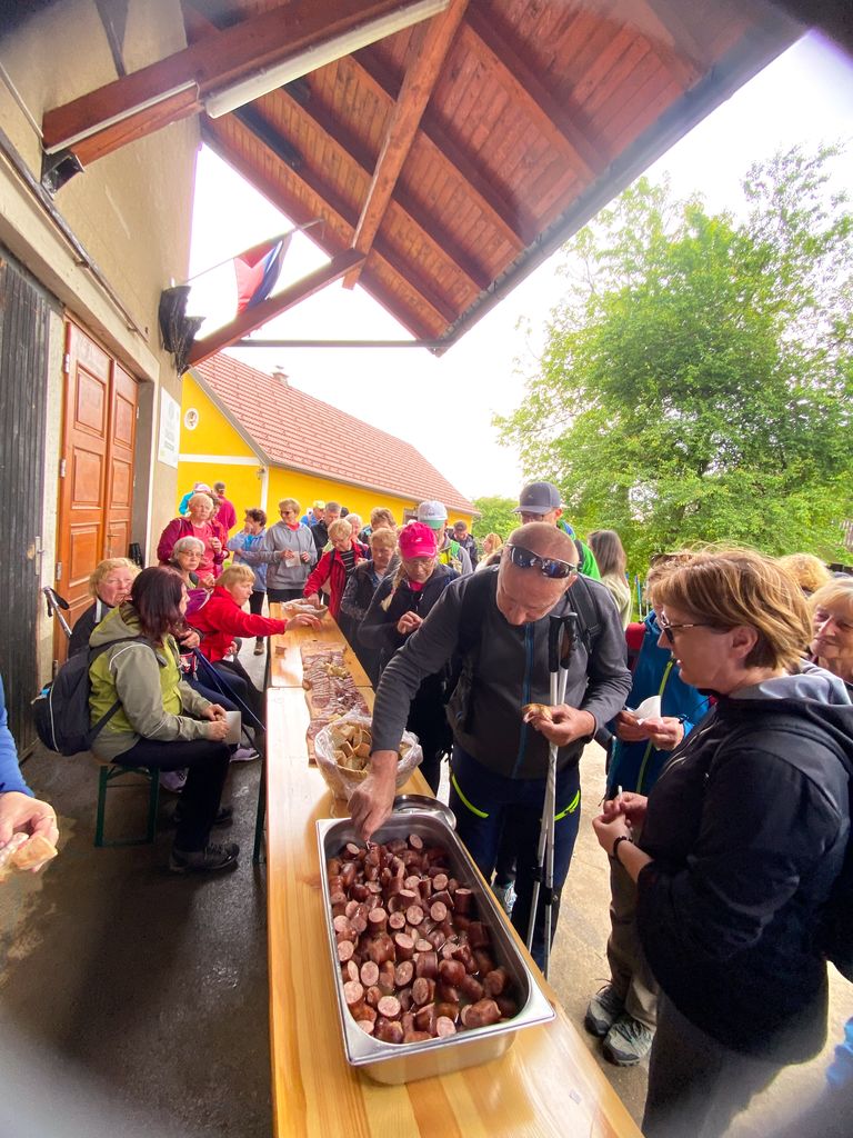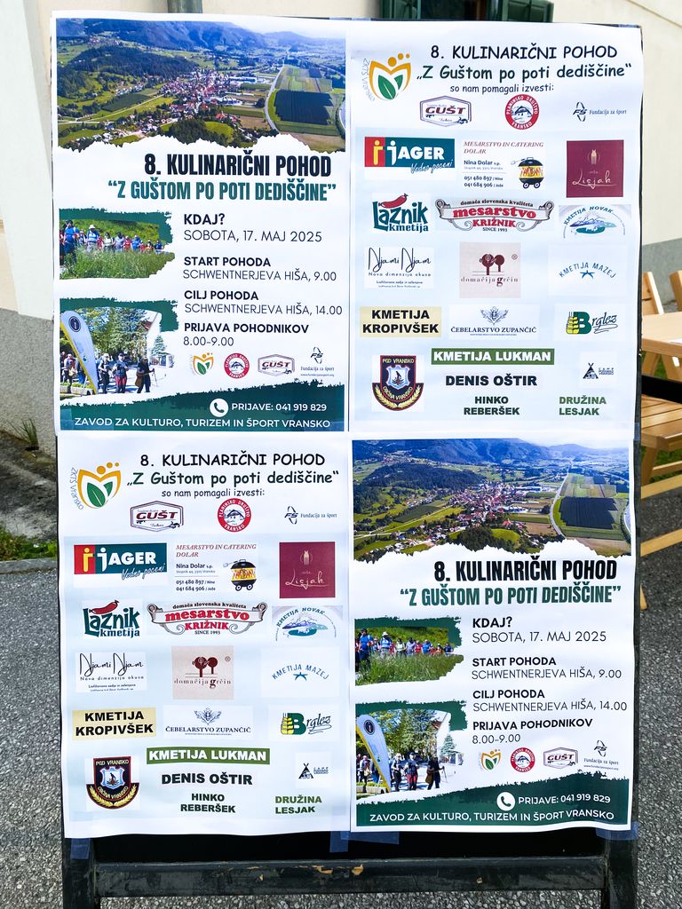 Tradicionalno smo se tretjo majsko soboto podali na pot tokrat že 8. kulinaričnega pohoda »Z Guštom po poti kulturne dediščine«. Po prijavi pohodnikov in degustaciji suhomesnatih izdelkov, sirov, kruha, medice in jabolčnega soka ter nagovoru podžupana Rafaela Novaka smo v nahrbtnik dali vodo in jabolka ter po Schwentnerjevi poti krenili proti Kampu Podgrad, ki smo si ga ogledali med sprehodom od ribnika do recepcije. Pred sabo smo že videli naslednjo postojanko pri cerkvi sv. Jeronima na Taboru. Nekaj besed o cerkvi, predvsem pa razgled po Spodnji Savinjski dolini in slastni jabolčni čips iz krušne peči nas bodo spominjali na drugi postanek na poti. To smo nadaljevali mimo Tane do Lesjakovih, kjer smo se odžejali in posladkali s piškoti. Od tu je sledil manjši vzpon, nato pa spust do Sela, kjer smo na postanku pri Davdovih okušali različne mesne dobrote. Pri Knežari v Brodeh je bila naslednja postaja. Tu smo brbončice razvajali z mladim sirom ter liofiliziranim sadjem in zelenjavo. Od tu je bilo le še streljaj do cilja v gasilskem domu na Vranskem, kjer sta nas čakala mesno-zelenjavna enolončnica in kozarček rujnega, s katerim smo nazdravili uspešno prehojeni približno 7,5-kilometrski poti.