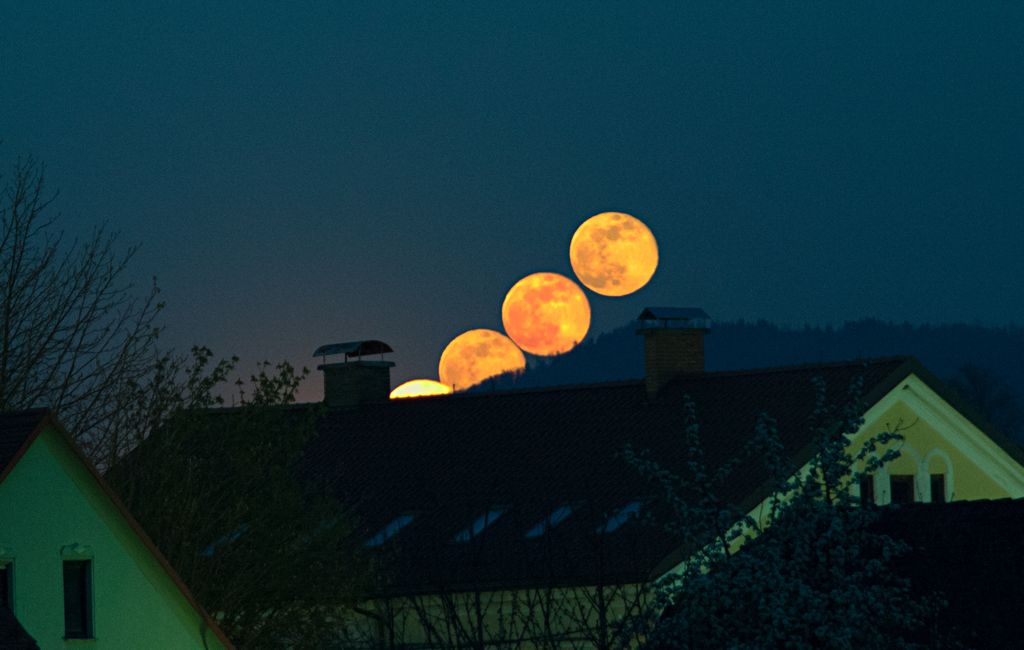 Prva aprilska tedna smo lahko uživali v čudovitem jasnem vremenu in kdor je zvečer stopil ven, je lahko na nebu opazil, kako Luna kraljuje s svojim sijem. Sploh zanimiva je, tik preden vzide in tik preden zaide, ko njena barva dobi nadih oranžno-rumenih odtenkov. Tak prizor sem spremljal 8. 4. od 19.28 dalje, ko sem jo fotografiral z domačega balkona, medtem ko je vzhajala in se dvigala. Na priloženi sliki so štirje položaji Lune v razmiku približno dveh minut. Posneto pri gorišču 135 mm; f/5,6; 1/45 s; ISO1600.