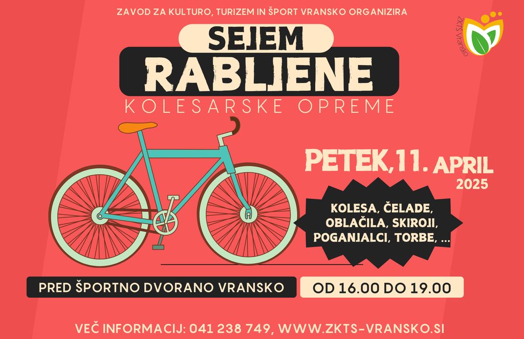 Vabljeni na sejem rabljene kolesarske opreme, ki bo potekal v petek, 11. aprila 2025, med 14. in 19. uro pred Športno dvorano Vransko. Na sejmu bodo na voljo čelade, otroški sedeži, kolesa in še veliko več.