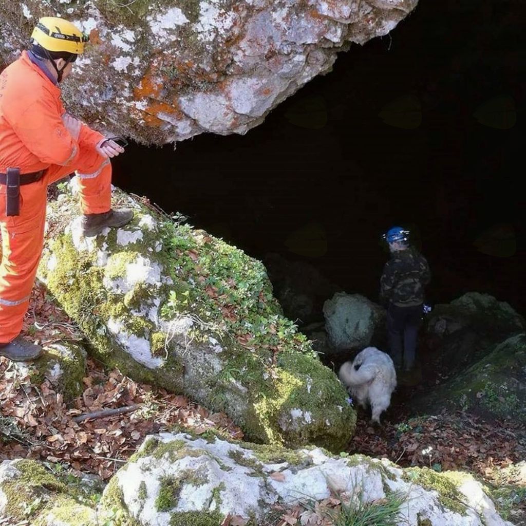 Po ogledu pa se je začelo zares. Marker se je skril za skalo, ovčarju se je snelo ovratnico in akcija je bila tu. Ovčar je pogumno zakorakal  po skalah in ovohaval sled. Nič se ni spraševal, pomembno mu je bilo, da reši nalogo. Pogumen reševalni pes. Nato je začel lajati v znak lastniku, da je našel markerja, vendar se je jamski prostor le poigral s svojim prepihom. Vonj je neslo na drugo stran skale mimo ozke špranje, oddaljene tri metre od markerja. Tako je pes lajal, nakazoval na najdbo, ampak je bil še daleč stran. Z malo trme in s pomočjo markerja je le zavil okoli skale in ga našel. Kasneje se je še veliko psov znašlo v podobnih težavah.