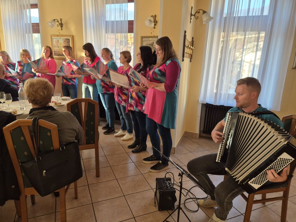 V začetku novembra smo upokojenci v Gostišču Slovan imeli martinovanje. Zbralo se nas je veliko. Seveda je bila na mizi martinova pojedina, nazdravili pa smo z moštom. Druženje so nam s čudovitim petjem popestrila dekleta (vzgojiteljice) iz vokalne instrumentalne skupine Sanje iz Zagorja ob Savi. Umetniški vodja je Taja Drolc Vučko. Skupino je na harmoniki in kitari spremljal Matej Zupančič. Ob venčku slovenskih narodnih pesmi pa smo tudi zapeli.