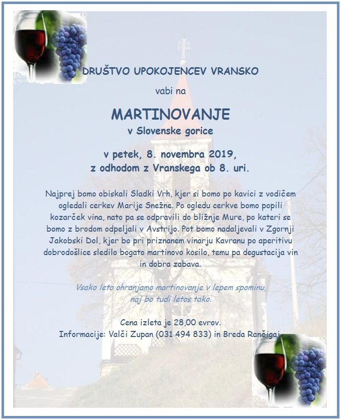 Najprej bomo obiskali Sladki Vrh, kjer si bomo po kavici z vodičem ogledali cerkev Marije Snežne. Po ogledu cerkve bomo popili kozarček vina, nato pa se odpravili do bližnje Mure, po kateri se bomo z brodom odpeljali v Avstrijo. Pot bomo nadaljevali v Zgornji Jakobski Dol, kjer bo pri priznanem vinarju Kavranu po aperitivu dobrodošlice sledilo bogato martinovo kosilo, temu pa degustacija vin in dobra zabava.