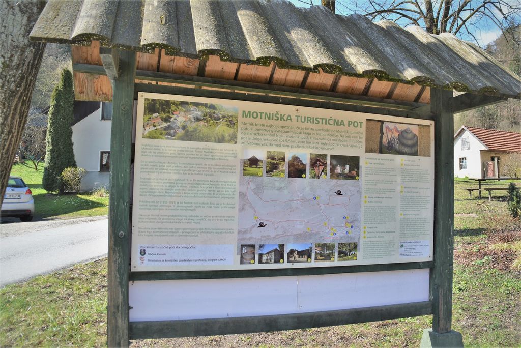 Motnik lahko najbolje spoznamo, če se sprehodimo po Motniški turistični poti, ki povezuje glavne zanimivosti kraja in bližnje okolice. Na poti nam bo delal družbo simbol trga – motniški polž, ki nas vabi, da mu sledimo. Turistična pot je dolga več kot 3,5 km, kar z ogledovanjem njenih znamenitosti pomeni najmanj dve, lahko pa tudi več ur dolgi sprehod. Če se sprehodimo po Motniku, bomo kmalu opazili, da se razlikuje od običajnih vaških naselij. Lega pod gradom, dve cerkvi, osrednji trg, razporeditev hiš ob glavni ulici ter velikost in zunanji izgledi hiš pričajo o tem, da je bil Motnik nekoč pomemben trg in obrtno središče, kjer se je živahno trgovalo. Približno sto let (1855–1951) je bil Motnik tudi rudarski kraj, saj je tu deloval rudnik rjavega premoga. V premogovnih slojih so našli fosile pritlikavega nosoroga, ki mu je posvečen manjši muzej. Danes je Motnik miren podeželski kraj, od koder se večina prebivalcev vozi na delo v Kamnik ali v Savinjsko dolino. Še vedno ima vlogo lokalnega središča, saj so v kraju trgovina, kulturni dom, dva gostinska lokala in manjši muzej. Na »zlate čase« Motnika, nas danes spominjajo grajski hrib z razvalinami gradu Motnik, glavni trg s sramotilnim stebrom – prangarjem in arhitekturni slog starih trških hiš z bogato izrezljanimi vrati in kamnitimi portali. Začetek turistične poti je središče trga s prangarjem, ki nosi letnico 1793, mogočne lipe pa so bile tam posajene leta 1936 ob smrti kralja Aleksandra. V parku pod lipami stoji tudi doprsni kip Gašperja Križnika, zaslužnega zbiratelja narodopisnega blaga Motnika in bližnje okolice. Turistična pot se iz parka nadaljuje do muzeja pritlikavega nosoroga, do kužnega znamenja in naprej do cerkva sv. Jurij in sv. Magdalene, Vrbančevega kozolca toplarja, vhoda v nekdanji rudnik, Krevlinovega mlina na Beli, Mlinarjevega kozolca, kjer je prostor za piknik, do kmetije Pri Jernejk, kjer se ukvarjajo z ekološkim kmetovanjem, čebelarstvom, gojenjem zelišč, zelenjave in jagodičja. Pot pa se sklene v središču Motnika, kjer je tudi znana gostilna Pri Flegarju, ki je ohranila svojo dejavnost skozi stoletja.