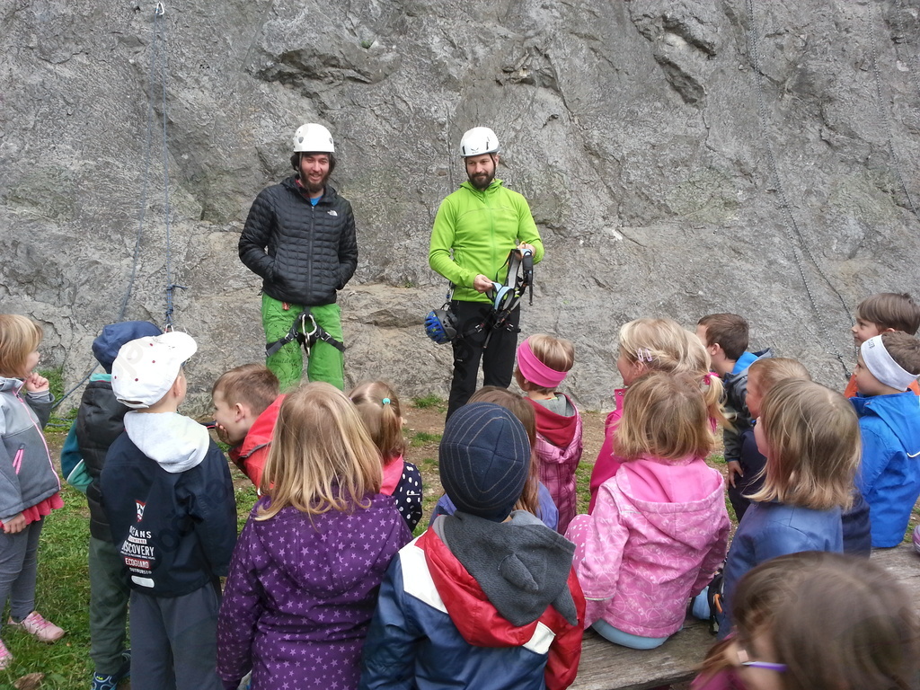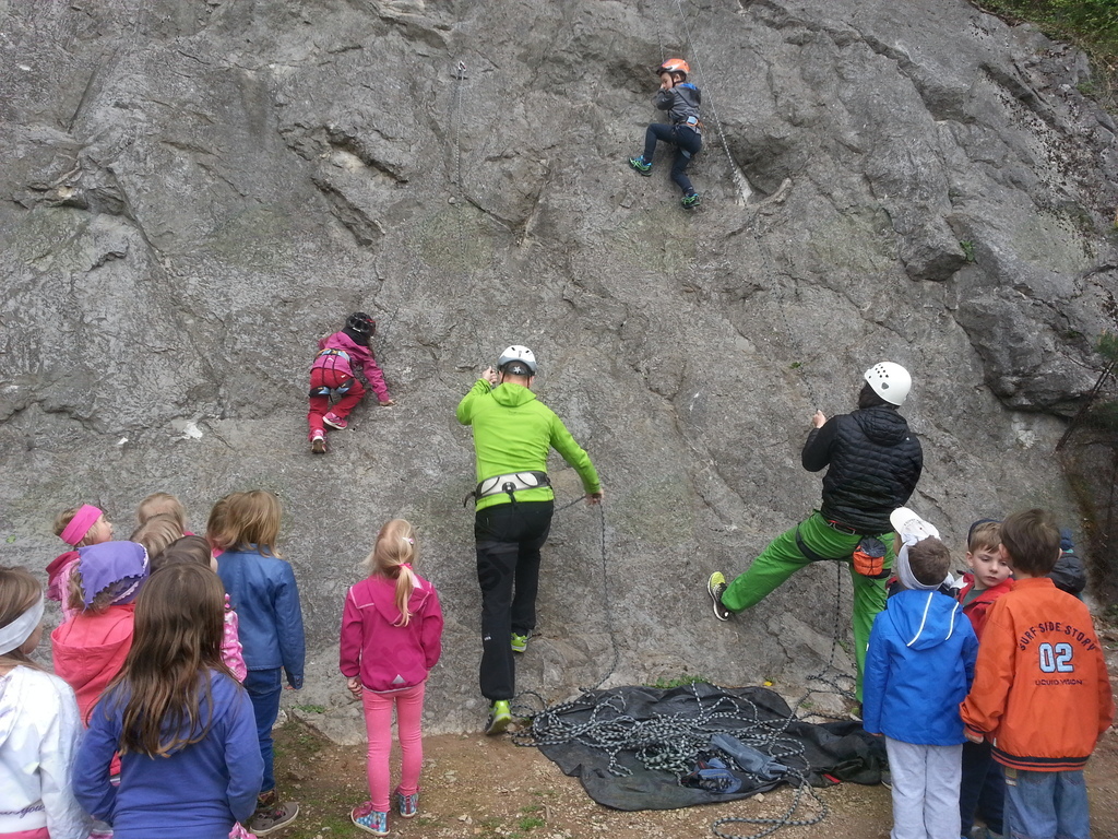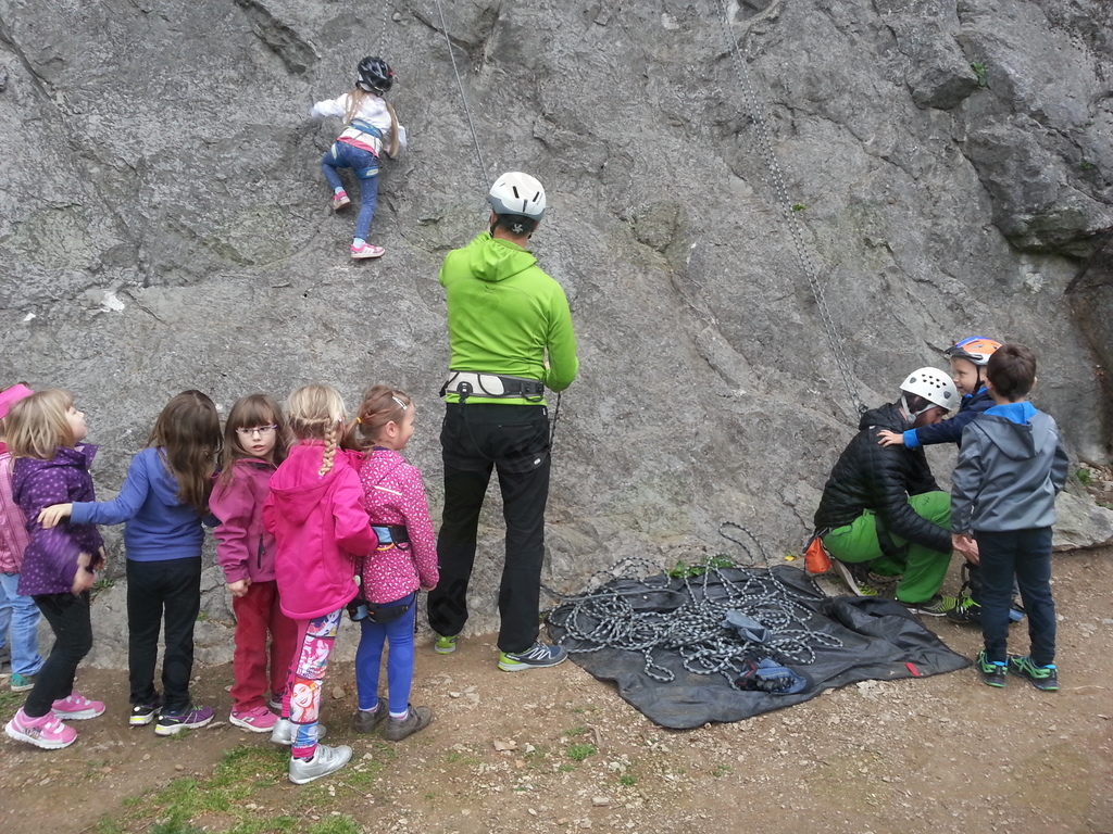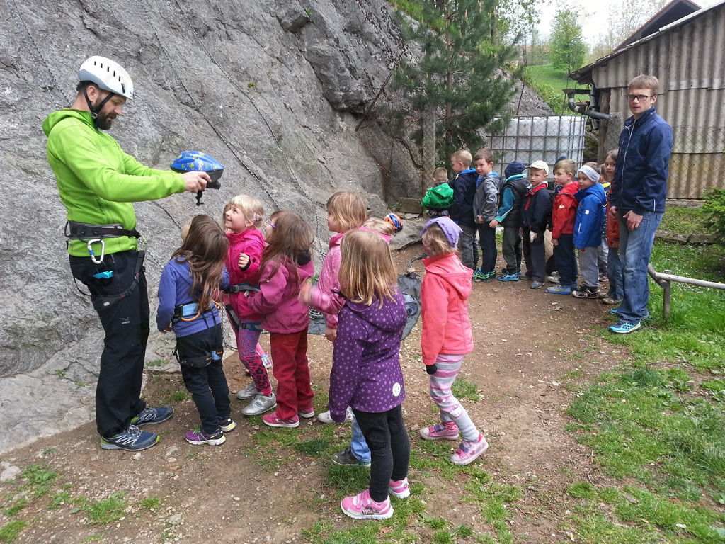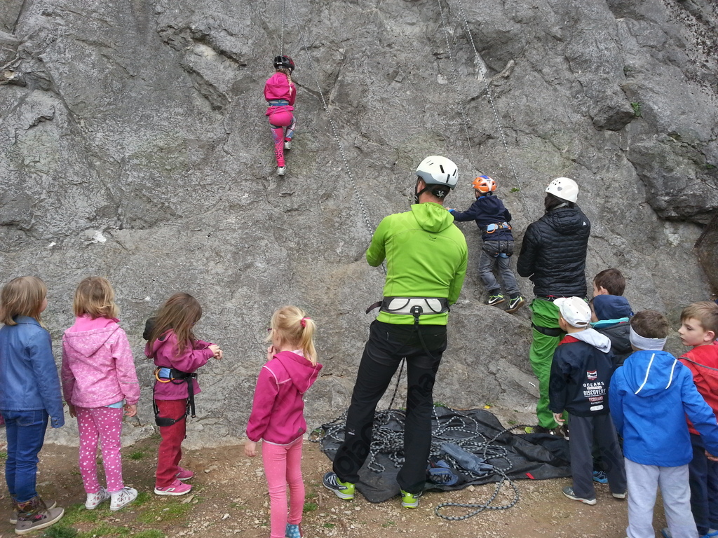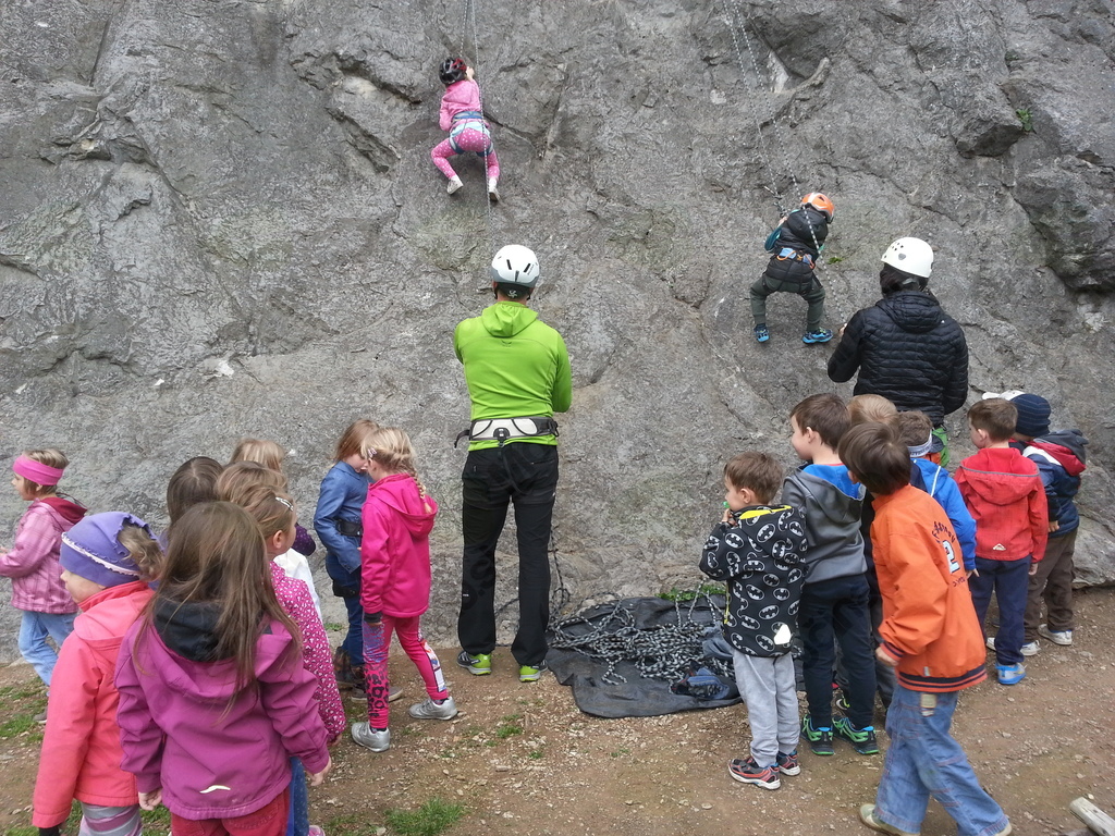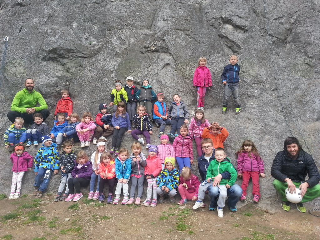 Tako smo se v torek, 19. 4. 2016, iz vrtca odpravili do plezalne stene, kjer sta nas pričakala g. Iztok Kolenc in g. Matic Vožič, pod okriljem Akademije za športe v naravi - SAVINJA. Dobro smo se ogreli in razmigali svoja telesa. Ko smo stali pred mogočno steno, starim kamnolomom, ki ga je čas izoblikoval v primernega za plezanje, smo tiho in z zanimanjem napeli ušesa. Gospoda Iztok in Matic sta dajala pomembne napotke. Otroci so se gnetli za prva mesta v kolonah pri preizkušanju plezanja. Pogumnim in samozavestnim posameznikom sta nadela plezalni pas in čelado, jih pripela na vrv in osvajanje plezalne stene se je začelo.