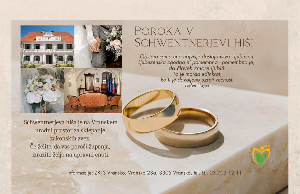 Schwentnerjeva hiša je na Vranskem uradni prostor za sklepanje zakonskih zvez. Če želite, da vas poroči županja izrazite željo na upravni enoti.