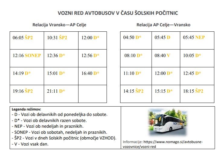 Legenda režimov: - D – Vozi ob delavnikih od ponedeljka do sobote. - D* – Vozi ob delavnikih, razen sobote. - NEP – Vozi ob nedeljah in praznikih. - SONEP – Vozi ob sobotah, nedeljah in praznikih. - ŠP2 – Vozi v dneh šolskih počitnic (območje VZHOD). - V – Vozi vsak dan. |