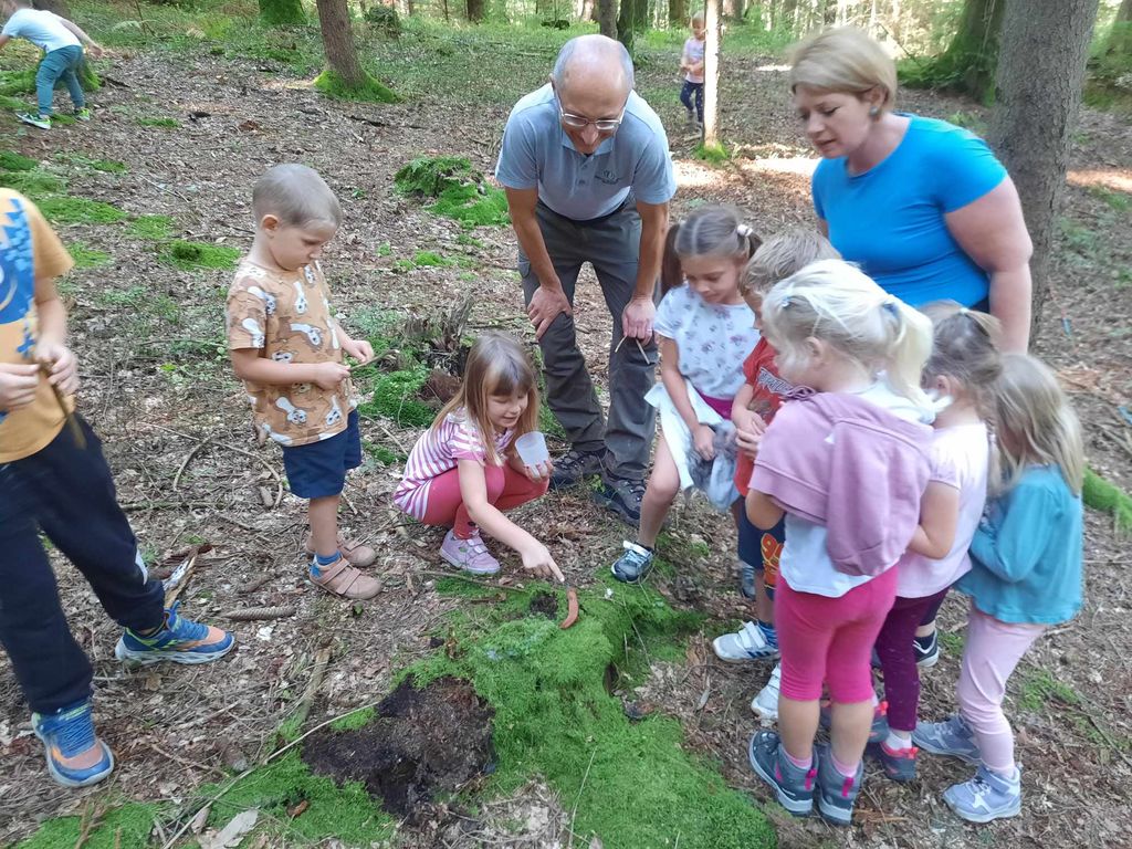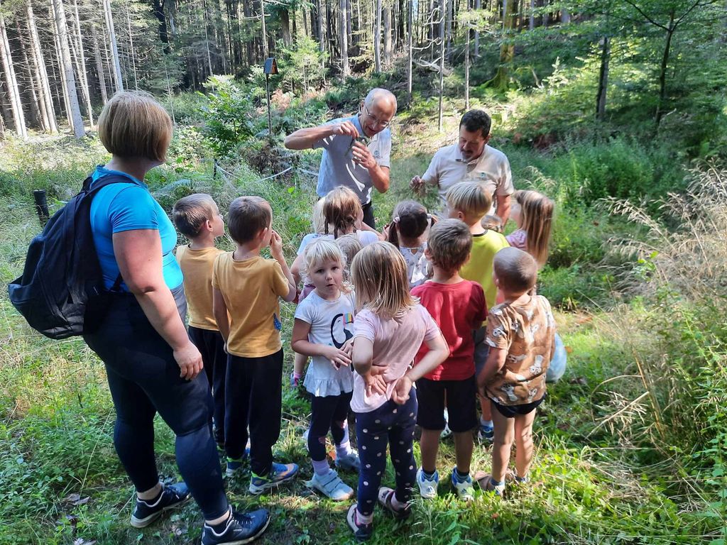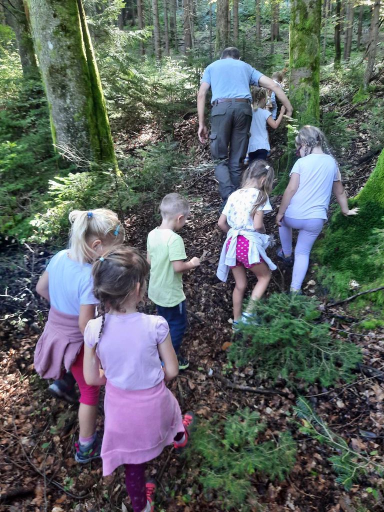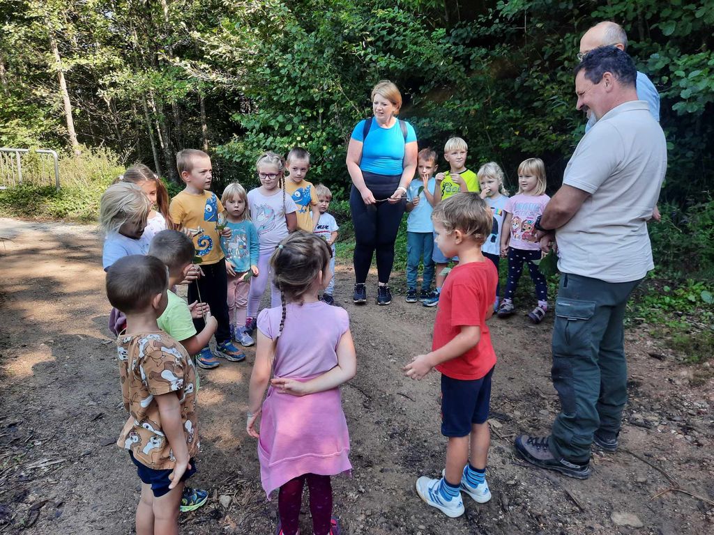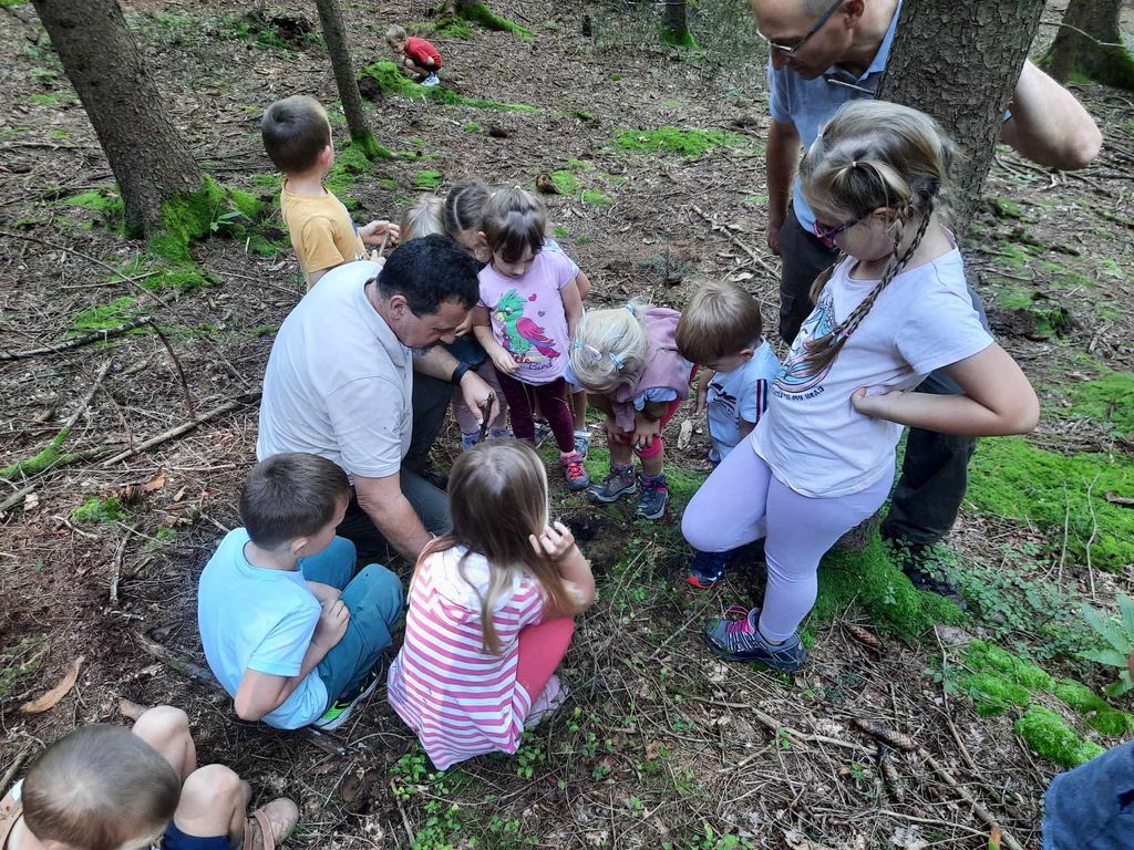 Gozdni škrati smo se na lep jesenski dan odpravili v gozd za Ilovico, kjer sta nas čakala gozdarja Janez in Jože. Ker je v krožku veliko novih otrok in se med sabo še ne poznamo, smo se šli najprej spoznavno igro natikanja listov na palico, ob tem pa je vsak povedal svoje ime. Polni pričakovanj smo se takoj zatem odpravili v gozd. Pot nas je vodila po različnih podlagah in preprekah, navzgor in navzdol. Včasih je bilo potrebno tudi kaj preskočiti. Prišli smo do jase, kjer sta stali dve drevesi, eno je imelo iglice, drugo pa ničesar. Ugotavljali smo, ali je živo ali ne. Vohali smo iglice jelke in smreke, si naredili gozdno dišeči parfum ter odpirali kostanjeve ježice ob poti. Ko smo prišli do lepe gozdne jase, smo okrog dreves napeli elastiko in poskušali z različnimi stvarmi iz gozda zadeti štor. S storži ni šlo, ker so bili pretežki, z velikimi palicami prav tako ne. Poiskati je bilo potrebno ravno prav velike palice, da je preizkus elastičnosti uspel. Na našem gozdnem igrišču se je ustavila tudi polžja družina, ki smo jo z velikim zanimanjem opazovali. Po štorih je raslo veliko mahov, ki smo jih pobožali in ugotavljali razlike med njimi. Gozdar nam je povedal, da je v Sloveniji kar osemsto vrst mahov in da so zaščiteni, zato jih ne smemo trgati. Z veliko novih spoznanj smo se odpravili nazaj v vrtec.