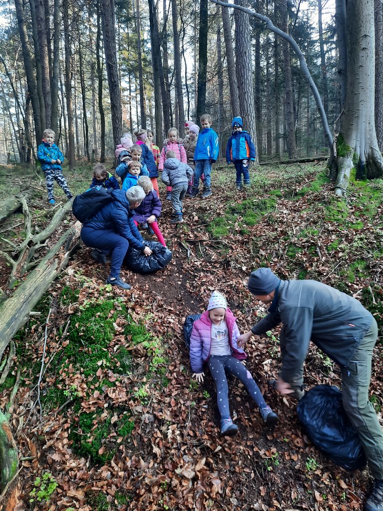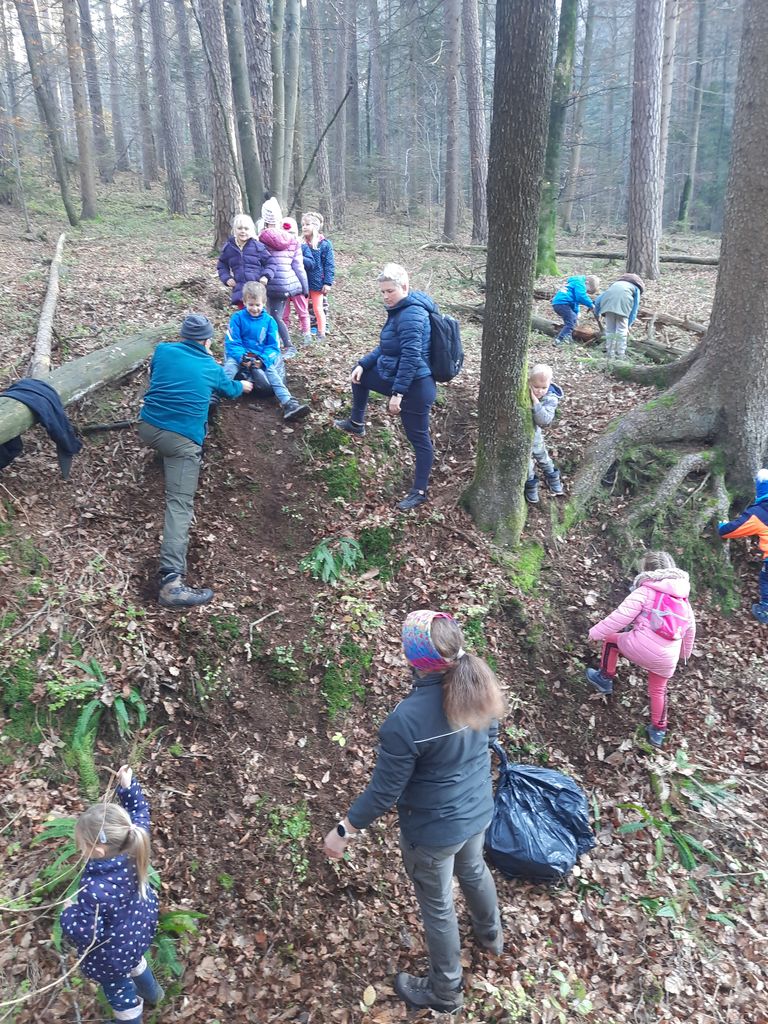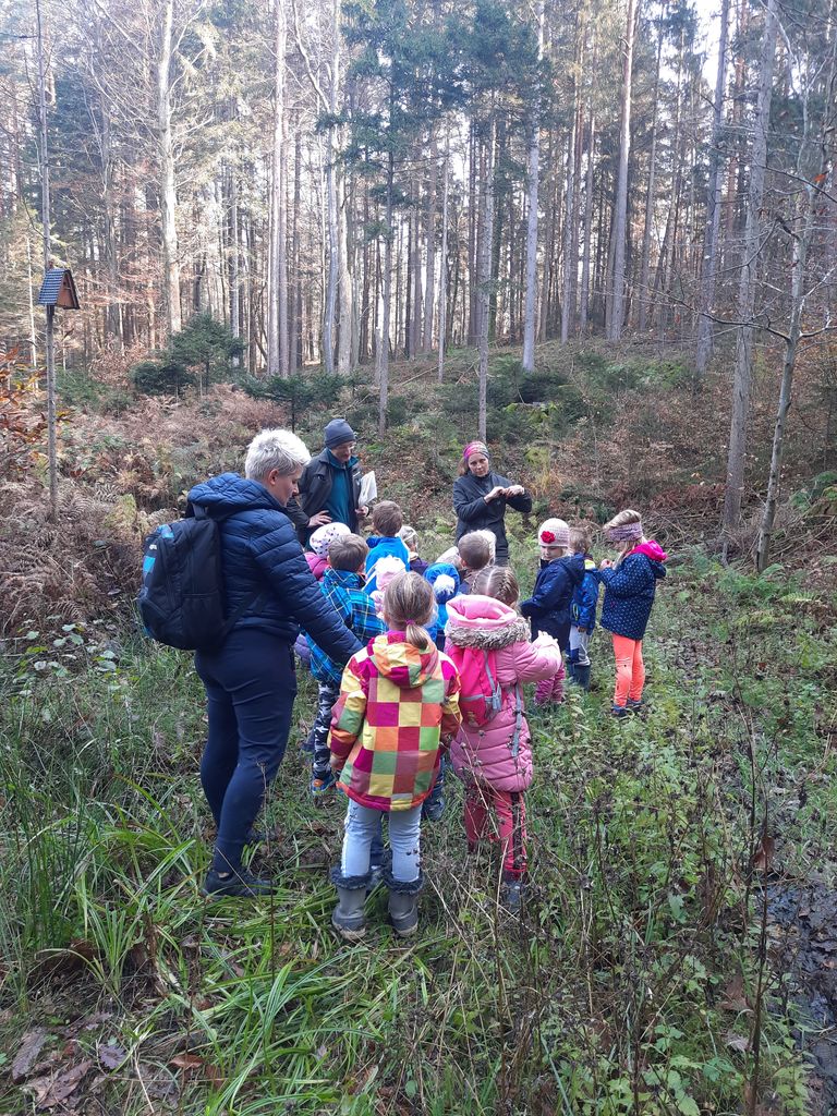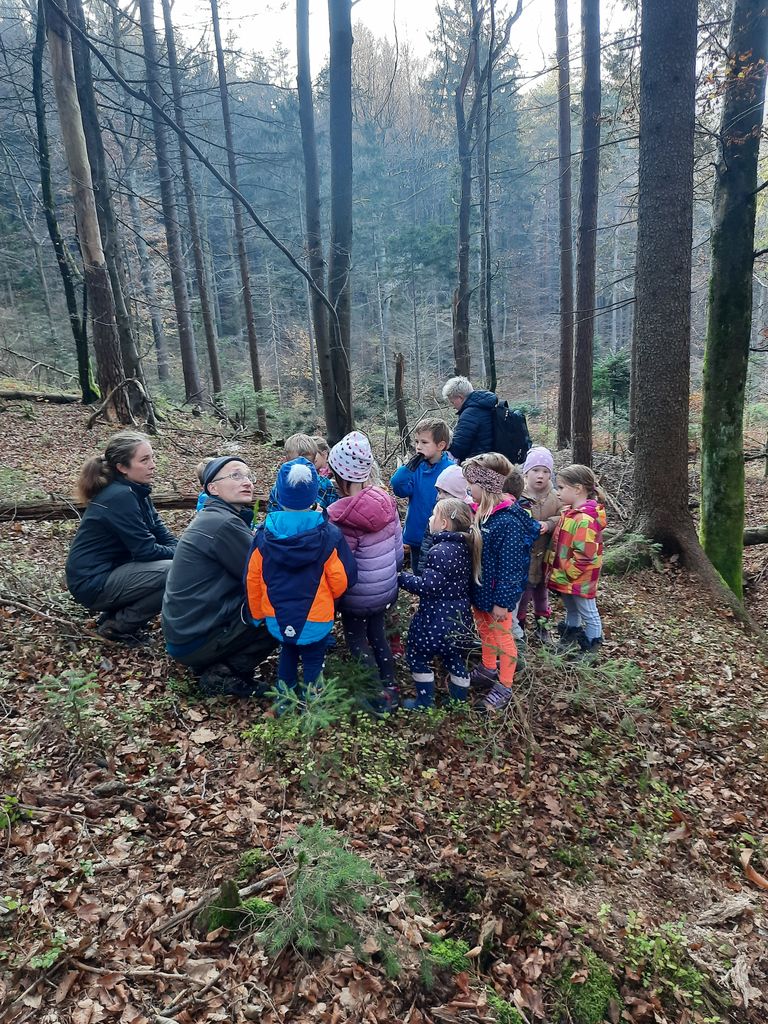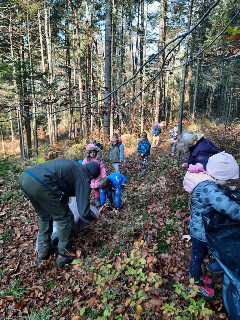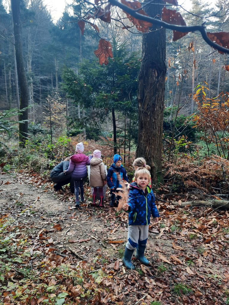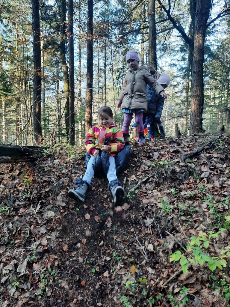 Hitre spremembe v naravi so nas, Gozdne škrate, ponovno privabile v gozd. Tokrat smo se odpravili v gozd na Ilovici, kjer smo se čudili velikosti dreves. Primerjali smo smreko in bor. Ugotovili smo, da imata različno lubje, iglice in tudi storže. V storžih smo poiskali semena, ki v vetrovnih dneh poletijo po gozdu in tam, kjer pristanejo, zraste novo drevo. Ob poti smo opazovali različne vrste praproti, ki jih je v Sloveniji veliko vrst. Tokrat smo spoznali praprot z imenom rebrenjača. Ker je gozd za Ilovico strm, smo si kot pripravo na zimske dni naredili pravo drčo, se popeljali v globine z žaklji, napolnjenimi z listi, ki smo si jih nabrali ob poti. Pri tem smo se veselili in zabavali. Gozd nas je popeljal skozi različne vonjave po gobah, zemlji, listih in smoli. Nazaj smo se vračali po drugi poti, polni ovir, ki smo jih premagovali eno za drugo. Pot nam je prekrižal tudi močerad, ki ga zaradi njegovih rumenih pik sredi rumenega listja skoraj nismo opazili. Ob robu gozda smo se poslovili od gozdarjev in se dogovorili, da se kmalu spet vidimo.