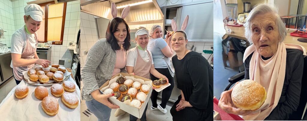 Pustni torek smo začeli z glasbo. Jernej nam je pripravil prijetno rajanje. Tudi v kuhinji je bilo na ta dan zelo pestro – naša pridna ekipa je spekla kar 200 krofov, ki so omamno dišali po celem domu. Bomo videli, ali bomo prihodnje leto to številko še povečali.