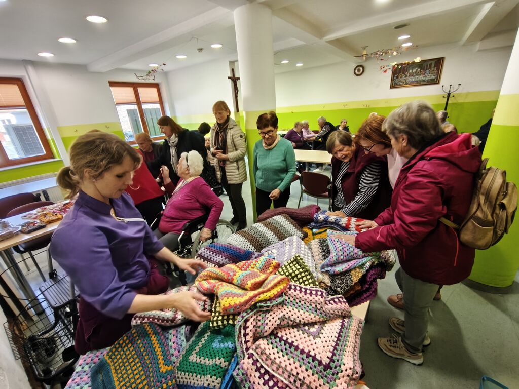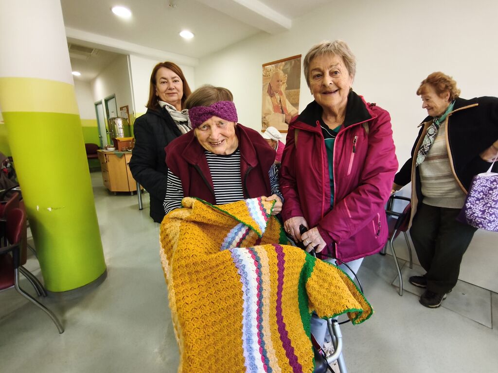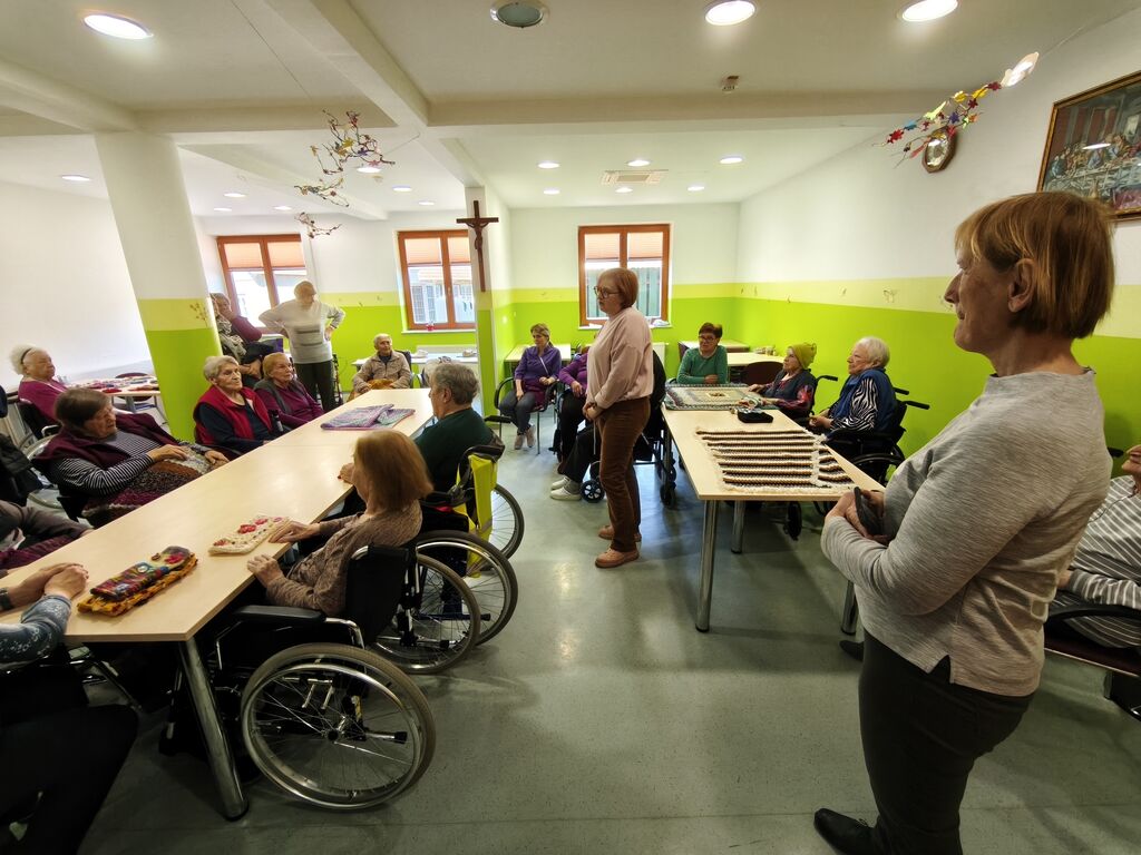 Obiskale so nas tudi upokojenke iz Šmartnega ob Paki, ki so nas razveselile z ročno izdelanimi darili. Prinesle so kvačkane dekice za vozičkarje, da se ob izhodih iz doma lahko ogrnejo, trakove za glavo, rokavičke za delo z dementnimi, žogice za stiskanje in še mnogo drugega. S toplimi besedami in srčnostjo so nam polepšale dan ter nam podarile nepozabne izdelke.