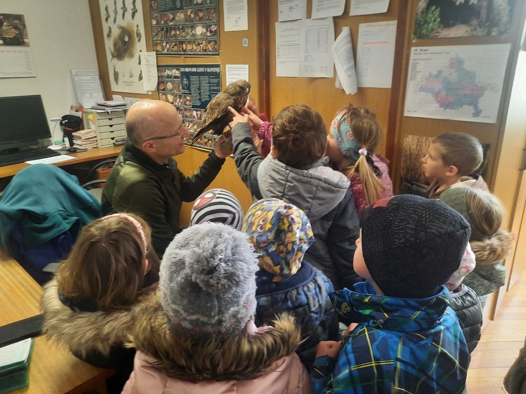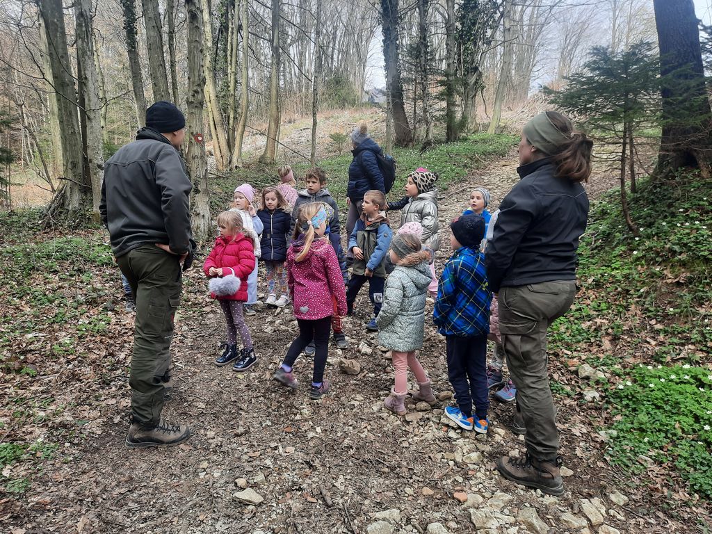 Dan je bil dokaj mrzel in vetroven, zato smo šli tokrat na sončen del gozda, na Briše. Ker pot iz vrtca na Briše vodi mimo pisarne naših gozdarjev, smo ju šli vsi skupaj iskat. V pisarni so radovedne otroške oči videle veliko zanimivega, zato se nismo mogli takoj odpraviti naprej. Gozdar Jože je moral vse živali, ki so bile na steni, pokazati bližje, da so jih otroci lahko potipali in ugotavljali, katere sploh so in ali so prave. Kanja, orel in vrana so burile domišljijo otrokom še del poti v gozd. Med hojo po gozdu so otroci pokazali, da imajo veliko znanja o pomladnih cvetlicah, gozdnih plodovih in drevesih. Gozdar je otrokom pokazal nekaj rastlin, ki so užitne tudi v pomladnem gozdu. Žvečili smo divji regrat, ki ima vonj po kuhanem krompirju, deteljico, trobentice. Ugotovili smo, da je jesen veliko bolj bogata s hrano v gozdu. Otroci so se spomnili na kostanj, gozdne jagode, gobe …
