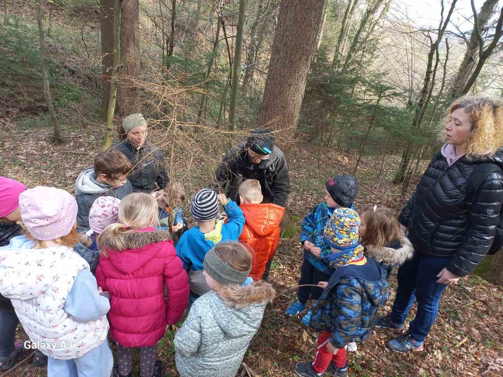 Prvi pomladni dan je hkrati tudi Mednarodni dan gozdov, ki ga Zavod za gozdove Slovenije obeležuje na pobudo Organizacije Združenih narodov za kmetijstvo in prehrano (FAO). V letu 2025 poteka pod geslom »Gozd in hrana«. Ravno na ta dan smo se Gozdni škratki skupaj z gozdarjema Jožetom in Špelo odpravili v gozd in raziskovali tematiko, ki jo je izpostavil FAO. Kot je zapisano tudi v Kurikulumu za vrtce, je pomembno, da otrok spoznava različno prehrano, pridobiva navade zdravega in raznolikega prehranjevanj ter ugotavlja, da mu uživanje različne hrane in gibanje pomagata ohranjati zdravje.