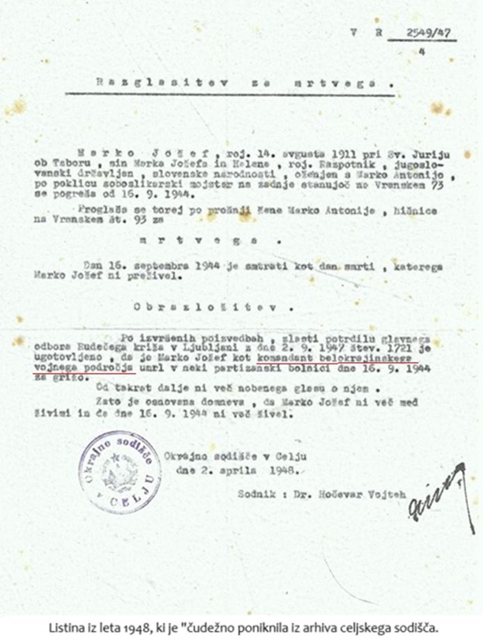 Leta 1958, ko sem obiskoval šesti razred, sem med brskanjem po maminih dokumentih našel listino o razglasitvi očeta za mrtvega. Iz nje sem razbral že znana dejstva. Med ostalim tudi to, da je bil moj oče, Jožef Marko, komandant belokranjskega vojnega področja, ki je umrl 16. 9. 1944 v neki partizanski bolnišnici. Opla! Mama pa mi je rekla, da se je od nje poslovil 16. 9. 1944, ko je odšel v partizane. Porajal se mi je prvi dvom. Upravičen, saj je listino o razglasitvi očeta za mrtvega 2. aprila 1948 izdalo takratno Okrajno sodišče v Celju.