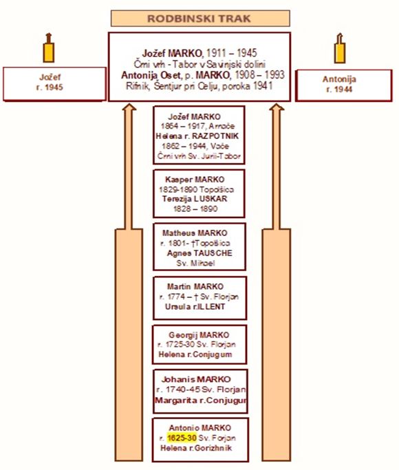 Sled me je peljala celo preko meje v Pliberk. Iz tamkajšnjih podatkov sem lahko samo delno potrdil sorodstvene vezi z mojimi predniki. Zato sem sprejel dejstvo, da je sled korenin mojega očeta in prednikov dokazljiva v Sv. Florjanu pri Šoštanju. Moj najstarejši prednik iz sedmega kolena, rojen pred 400 leti, je bil Antonio MARKO, rojen med 1625–30, poročen s Heleno, rojeno Gorizhnik.
