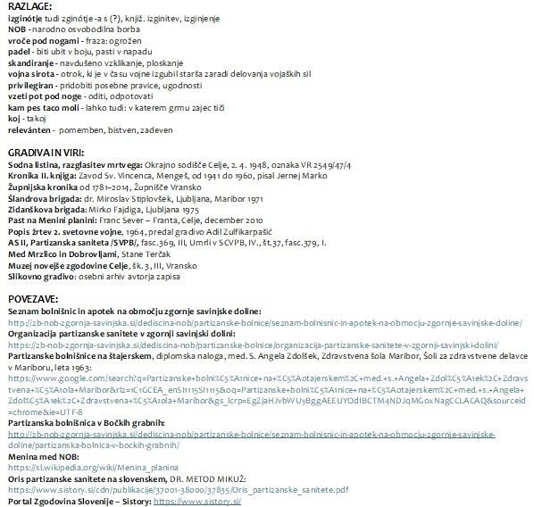 Kljub vsem nejasnostim pa sem prepričan, da je okupator ranjenega očeta ubil na Menini planini, kar potrjuje zapis v stričevi kroniki. Glede bolnišnic pa bo verjetno ostalo nepojasnjeno še naprej.