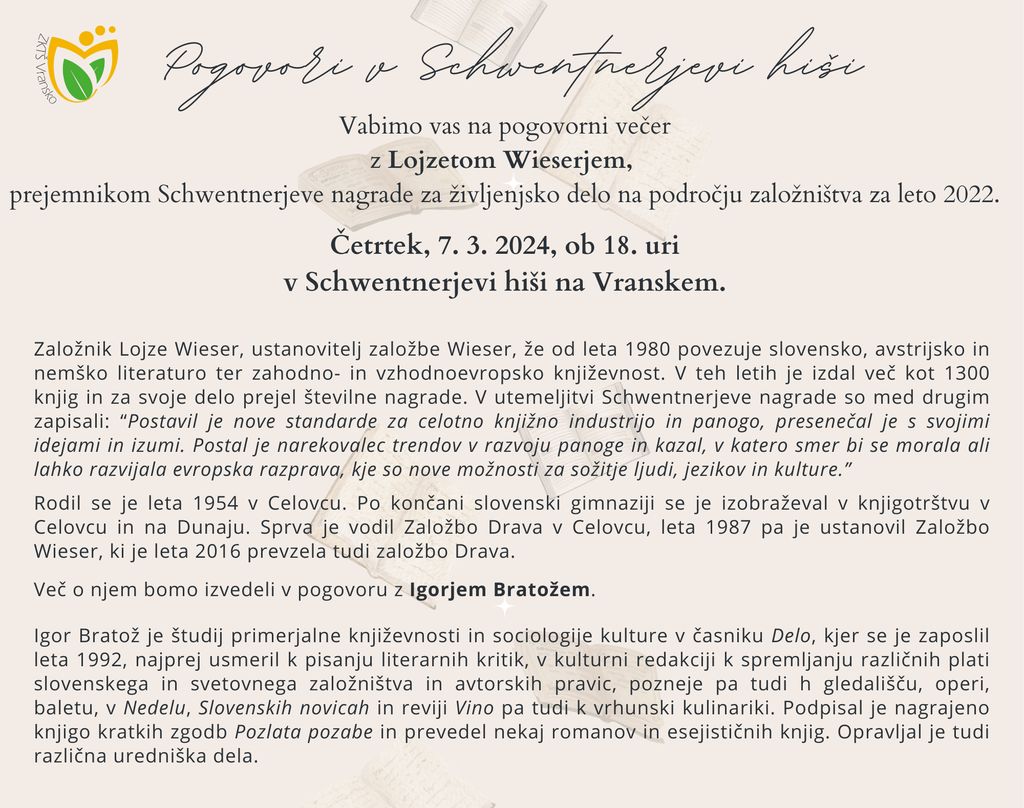 Založnik Lojze Wieser, ustanovitelj založbe Wieser, že šestintrideset let povezuje slovensko, avstrijsko in nemško literaturo ter zahodno- in vzhodnoevropsko književnost. V teh letih je izdal več kot 1300 knjig in za svoje delo prejel številne nagrade. V utemeljitvi Schwentnerjeve nagrade so med drugim zapisali: "Postavil je nove standarde za celotno knjižno industrijo in panogo, presenečal je s svojimi idejami in izumi. Postal je narekovalec trendov v razvoju panoge in kazal, v katero smer bi se morala ali lahko razvijala evropska razprava, kje so nove možnosti za sožitje ljudi, jezikov in kulture."