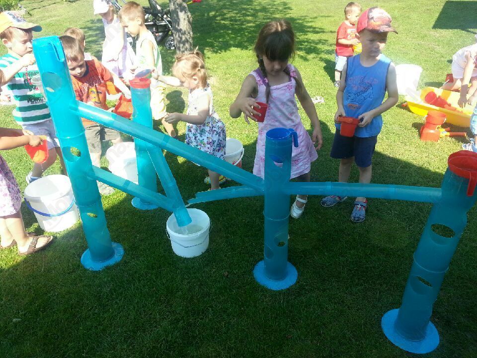 Poleg iger, ki nam jih nudijo igrala in materiali na igrišču, smo se veliko igrali tudi z vodo. Otroci so si sestavili vodni hidrant in vodni tobogan, kar je od njih zahtevalo veliko dogovarjanja, razmišljanja in logičnega sklepanja. Sami so si poiskali rekvizite, ki so jih pri tej igri uporabili (lončke, ladjice, vedra, žoge …). Pri igri z vodo so morali biti izjemno varčni z vodo, saj na igrišču nimamo tekoče vode in jo hodimo iskat v bližnji potok ali v vrtec. Ustvarjalne ideje pri igri z vodo so zajemale lovljenje rib in rakov, »nevihto na morju«, »gradbišče«, »prince in princese«, »poplavo«, škropljenje z vodo in še in še.