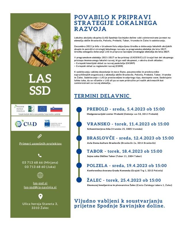 Lokalna akcijska skupina (LAS) Spodnje Savinjske doline vabi zainteresirano javnost na območju občin Braslovče, Polzela, Prebold, Tabor, Vransko in Žalec k sodelovanju.