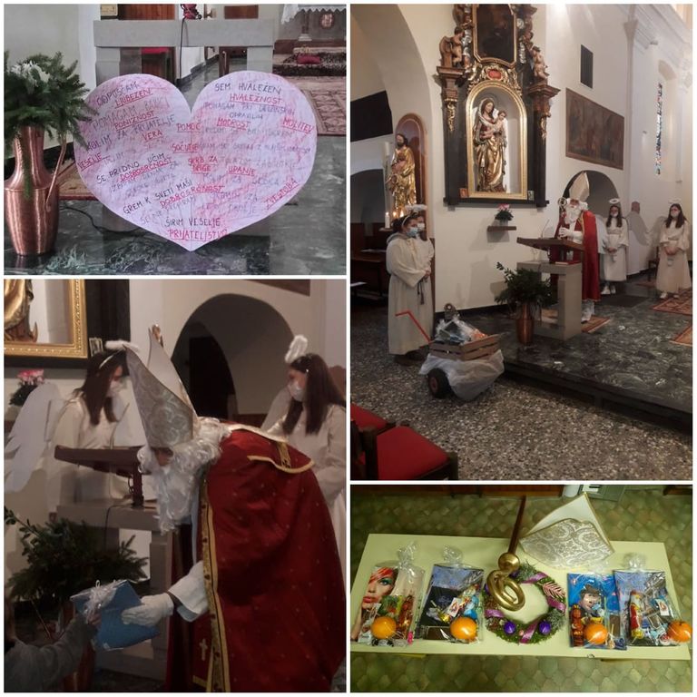 V nedeljo, 5. decembra, na dan pred godom sv. Miklavža, pa smo po sveti maši doživeli presenečenje. Obiskal nas je sv. Miklavž.:) Njegovega prihoda smo bili veseli vsi, še posebej otroci. Miklavža so spremljali angeli, parkeljnov pa ni bilo. Hm, to pomeni, da smo bili zelo, zelo pridni. Sv. Miklavž nas je nagovoril z besedami upanja in veselja. Otroke je povabil, da skupaj z njim zmolijo molitev in jim razdelil darila.