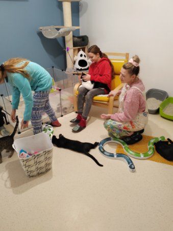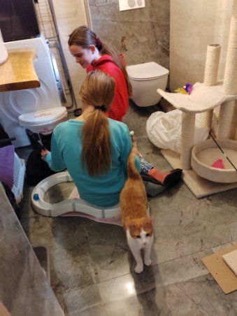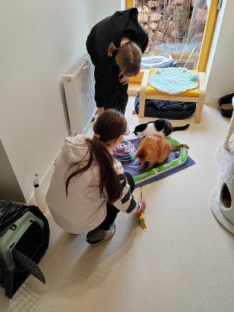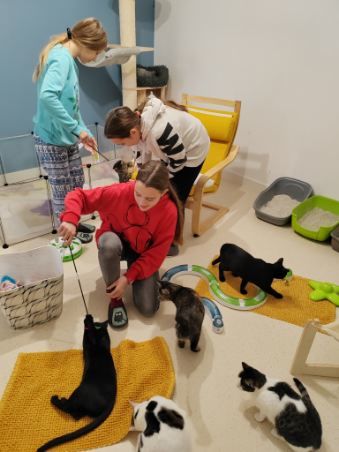 Najprej smo šli v prvo sobo. V tej sobi sta bila dva mačka po imenu Loti in Bučka. Bila sta zelo luštna! Ko smo se nekaj časa igrali z njima, smo si spet razkužili roke in šli v naslednjo sobo. Tam so bili trije mački, ki jim je bilo ime: Asterix, Obelix in Angelika. Imeli so veliko igrač, s katerimi so se radi igrali. Vsak je imel svoj hiško in mehko posteljico. Ko smo šli v tretjo sobo, smo si pred vhodom še enkrat razkužili roke. V tretji sobi je bilo štirinajst mačk. Bile so mlade, mlajše od enega leta starosti. V tej isti sobi je bila večja škatla z igračami, s katerimi so se zelo rade igrale. Nato smo šli še v zadnjo sobo. V tej sobi so bile malo starejše muce. Ime jim je bilo: Uška, Piškot, Jaka in Moly.