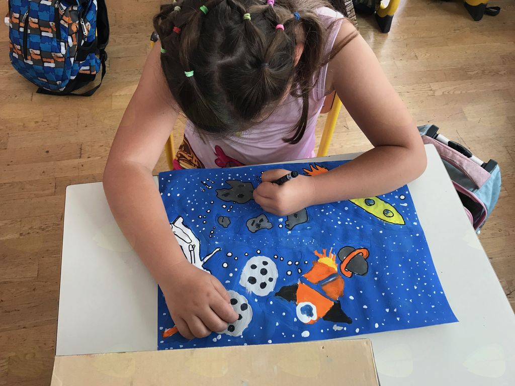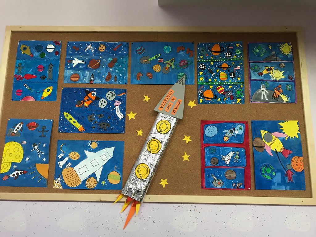 Učenci so naslikali, kot so si ga pač predstavljali, svoj polet v vesolje. Ogledali smo si razstavo, ki so jo o vesolju pripravili prvošolci, in to nas je še bolj spodbudilo k raziskovanju.