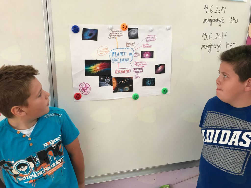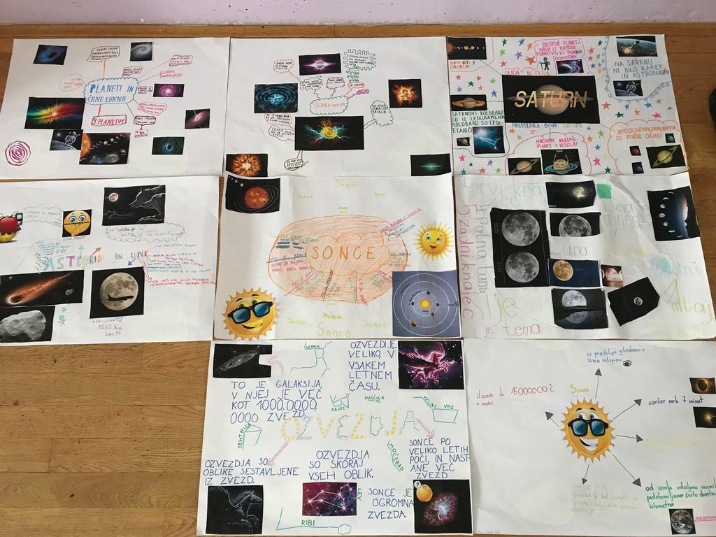 Vsak izmed nas si je sam izbral temo, ki ga je zanimala, in je v knjigah sam ali v paru iskal podatke. V sredo nas je čakalo zelo zanimivo delo. Prvi dve uri smo dopolnjevali svoje zapise o izbranih temah in iskali podatke na spletu ter v knjižnici. Tretjo uro pa smo se odpravili v planetarij, ki je bil postavljen v eni izmed učilnic. V planetariju smo videli ozvezdja, planete in njihove lune. Izvedeli smo, da imajo nekateri planeti po več lun, nekateri pa so brez njih. Spoznali smo različna ozvezdja, asteroide, komete, gospod nam je pokazal črne luknje in nam povedal, kaj je to. Z obiskom planetarija in s predstavitvijo, ki smo jo doživeli v njem, smo lahko s slišanimi podatki dopolnili naše plakate. Po ogledu smo se odpravili v računalniško učilnico, kjer smo iskali podatke na spletu, si pripravili fotografije in jih natisnili.
