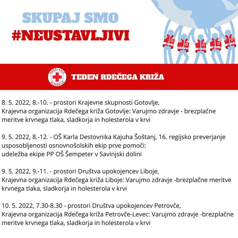 »Ob izrednih razmerah, v katerih smo zaradi pandemije živeli dobri dve leti, ob očitnih podnebnih spremembah, ki se kažejo v poplavah, sušah, vetrolomih, točah in drugih ujmah, ob konfliktu v Ukrajini ter aktualnih geopolitično nestabilnih razmerah, ki sprožajo verižne reakcije v gospodarskem in socialnem razvoju, smo priča pospešeni rasti števila ljudi, ki so v stiski, razseljeni ali živijo pod pragom revščine ter potrebujejo našo solidarnost in pomoč. Časi niso lahki, a vendar, vsako težko obdobje prinaša tudi žarke upanja, ki v obliki solidarnosti posijejo in nam vsem skupaj dajo energijo,« v svoji poslanici ob tednu Rdečega križa Slovenije sporoča predsednica Rdečega križa Slovenije mag. Vesna Mikuž. Ob tej priložnosti se je zahvalila vsem prostovoljcem, krvodajalcem, donatorjem, podpornikom in zaposlenim za izkazano pomoč in podporo delovanju Rdečega križa Slovenije.